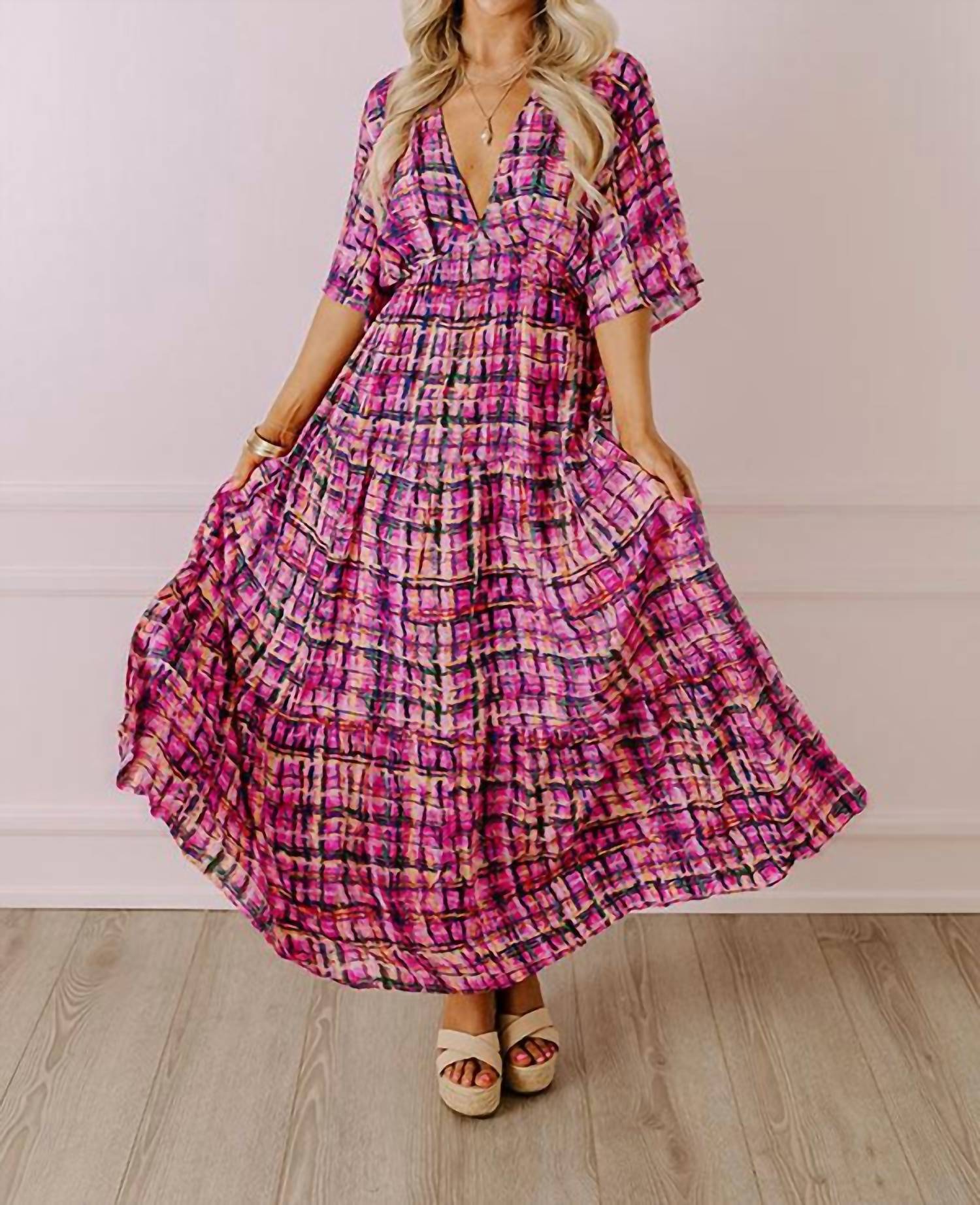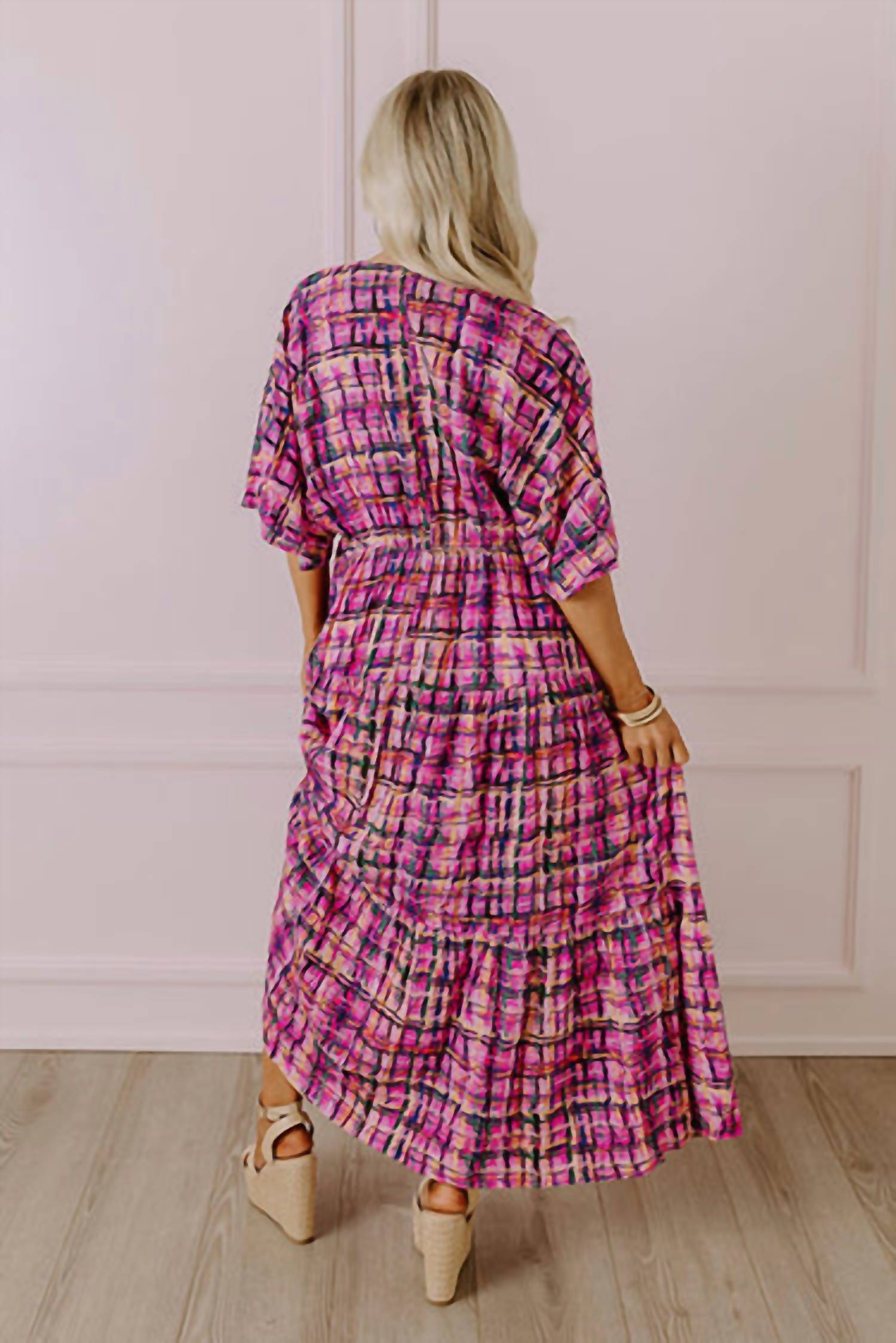 Comfortable and cute, this casual day dress has it all. The Pretty in Plaid Maxi Dress by Entro is a breezy statement piece for year-round wear with its colorful plaid print on a bold hot pink base. Designed with short sleeves and a deep V-neckline, this dress offers a flowy A-line silhouette and an elastic waist that flatters every shape. Made from 100% Rayon, this dress is lightweight and fully lined for non-sheer wear. Enjoy effortless style with a pull-on closure and maintain its vibrant look by hand washing and line drying. Shea, who is 5’1”, is wearing an XL, showcasing the true-to-size fit. Ideal for casual occasions or a dinner party, it's versatile enough for any spring outing or seasonal celebration.