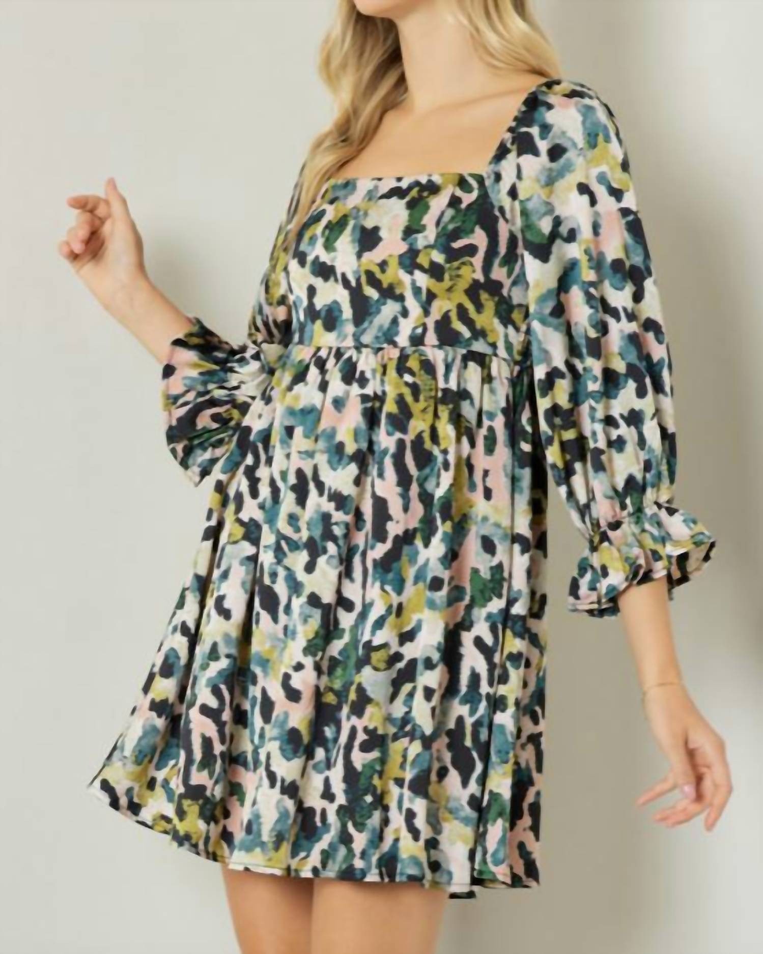Step into elegance with the Print Mini Dress by Entro, showcasing a playful green mauve palette. This dress features a square neck and three-quarter sleeves with ruffled elastic detailing. Crafted from lightweight, non-sheer woven polyester, it offers a chic empire waist silhouette. Closure: Pull-On. Care: Machine wash.