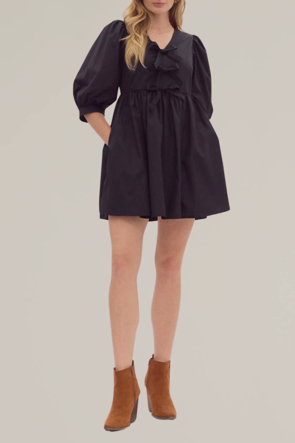 A short and breezy dress for those warmer days. Elevate your style with the Puff Sleeve Tie Front Dress by Entro, a charming addition to any wardrobe. This stunning dress features elegant long puff sleeves, crafted from a blend of 80% polyester and 20% cotton, promising comfort and style. It boasts a solid pattern with a sophisticated V-neckline and a chic tie-front design. Closure is secured with a back zip, while side pockets provide both style and practicality for any occasion. Care for this beautiful mini A-line silhouette effortlessly by gently washing it in cold water and line drying. Model is 5'10" and wearing a size small.