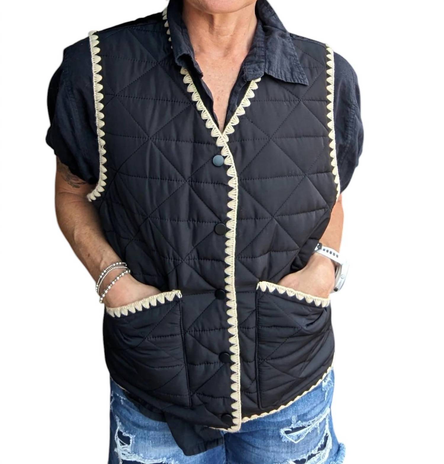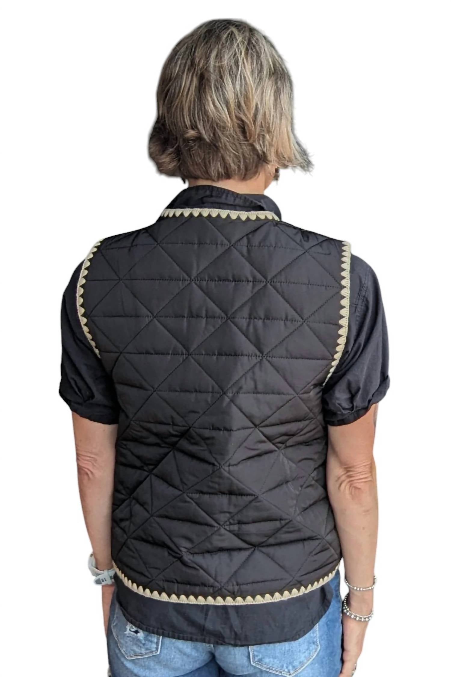 This Quilted Vest features a solid quilted design with a scalloped trim and snap button closure. With short sleeves and pockets, it adds dimension to any outfit without a lining.