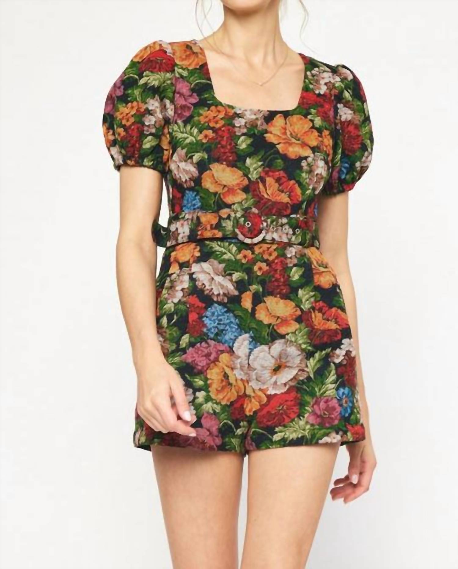 The perfect outfit choice when you you need something quick to throw on and still want to look efforlessly cool. This romper features puff sleeves and a square neckline for a modern, flirty aesthetic, complete with functional side pockets and a belted waist for a flattering fit. Composition: Self - 70% Polyester, 30% Cotton; Lining - 80% Polyester, 20% Cotton. Zip closure at the back. Imported.
