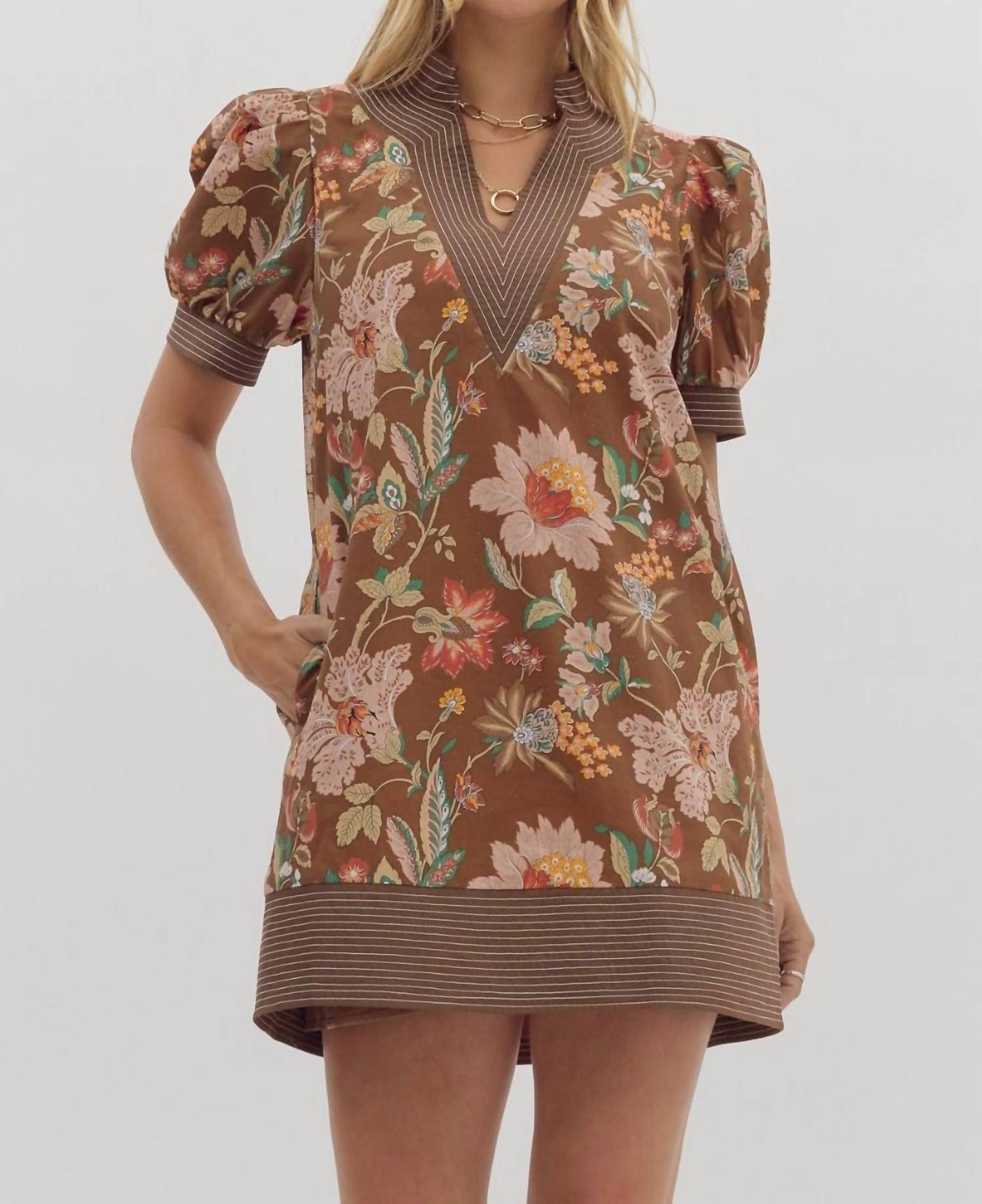 Discover the Renee Fall Floral Mini Dress by Entro, an ideal choice for your summer occasions. This charming dress in brown boasts a playful floral print, featuring short puff sleeves and a flattering pullover A-line silhouette. Made from 100% cotton, it offers a breathable and comfortable fit with a convenient pullover design. Care: Machine wash per instructions.