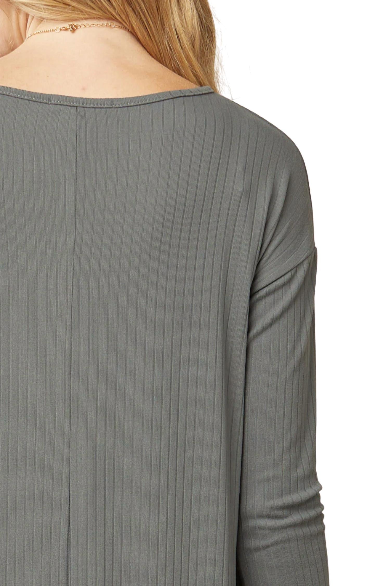 The perfect length dress does exist. Features a round neckline, dropped shoulders, long sleeves, side seam pockets, a scooped high-low hemline, and a midi silhouette. Small: Bust 42", Length 44". Medium: Bust 44", Length 44". Large: Bust 46", Length 44". Back hem is longer. 95% polyester, 5% spandex. Made in the USA. Hand wash or dry clean.