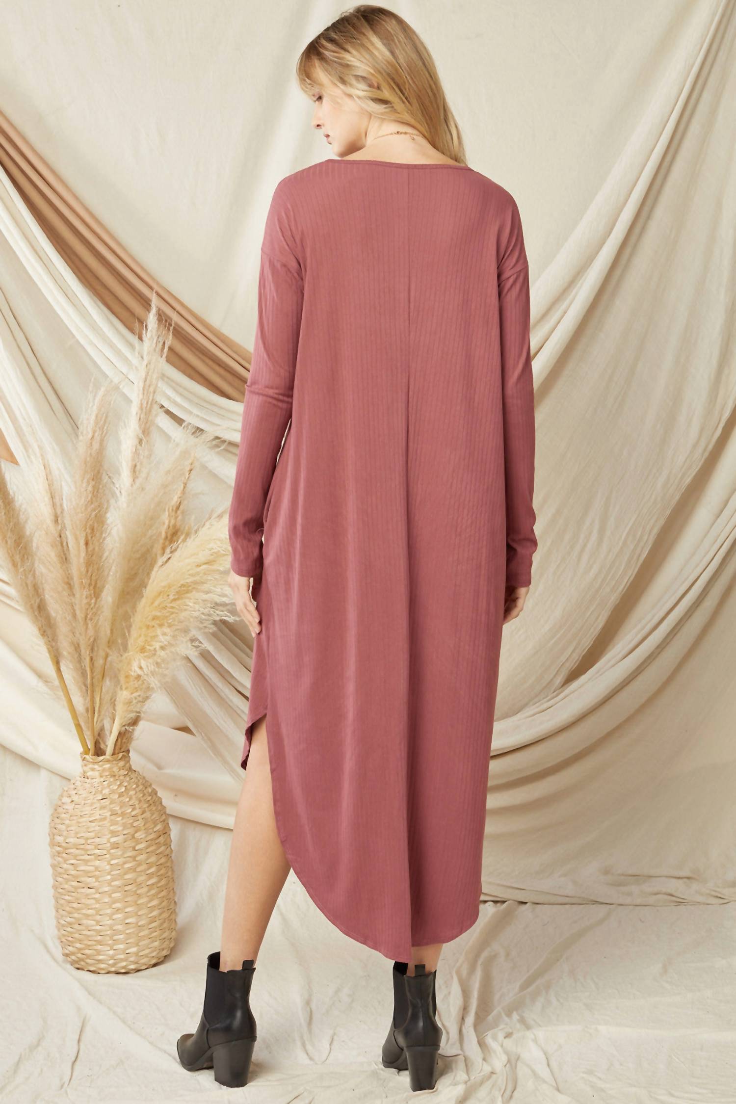 Step out in style with the Ribbed Pocket Midi Dress by Entro in a chic Dusty Mauve. This solid midi dress features long sleeves, a round neckline, and a scooped high-low hemline for a flattering silhouette. Composed of 95% polyester and 5% spandex, it's crafted in the USA with a soft, stretchy ribbed fabric and includes side seam pockets for added convenience. Closure type: Pull-on. Care instructions: Hand wash or dry clean. Available in bust sizes: Small 42", Medium 44", Large 46". Length is consistently 44” with a slightly longer back.