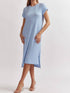 Step into summer style with the Ribbed Short Sleeve Midi Dress by Entro, expertly crafted for flair and comfort. This light blue dress features short sleeves and a crewneck to keep you looking chic, while the textured A-line silhouette and side hem slit add a touch of modern elegance. Its composition of 76% Polyester, 21% Rayon, and 3% Spandex ensures a lightweight, non-sheer fit that's as comfortable as it is flattering. Designed for easy wear with a pull-on closure, it's a perfect addition for any occasion.