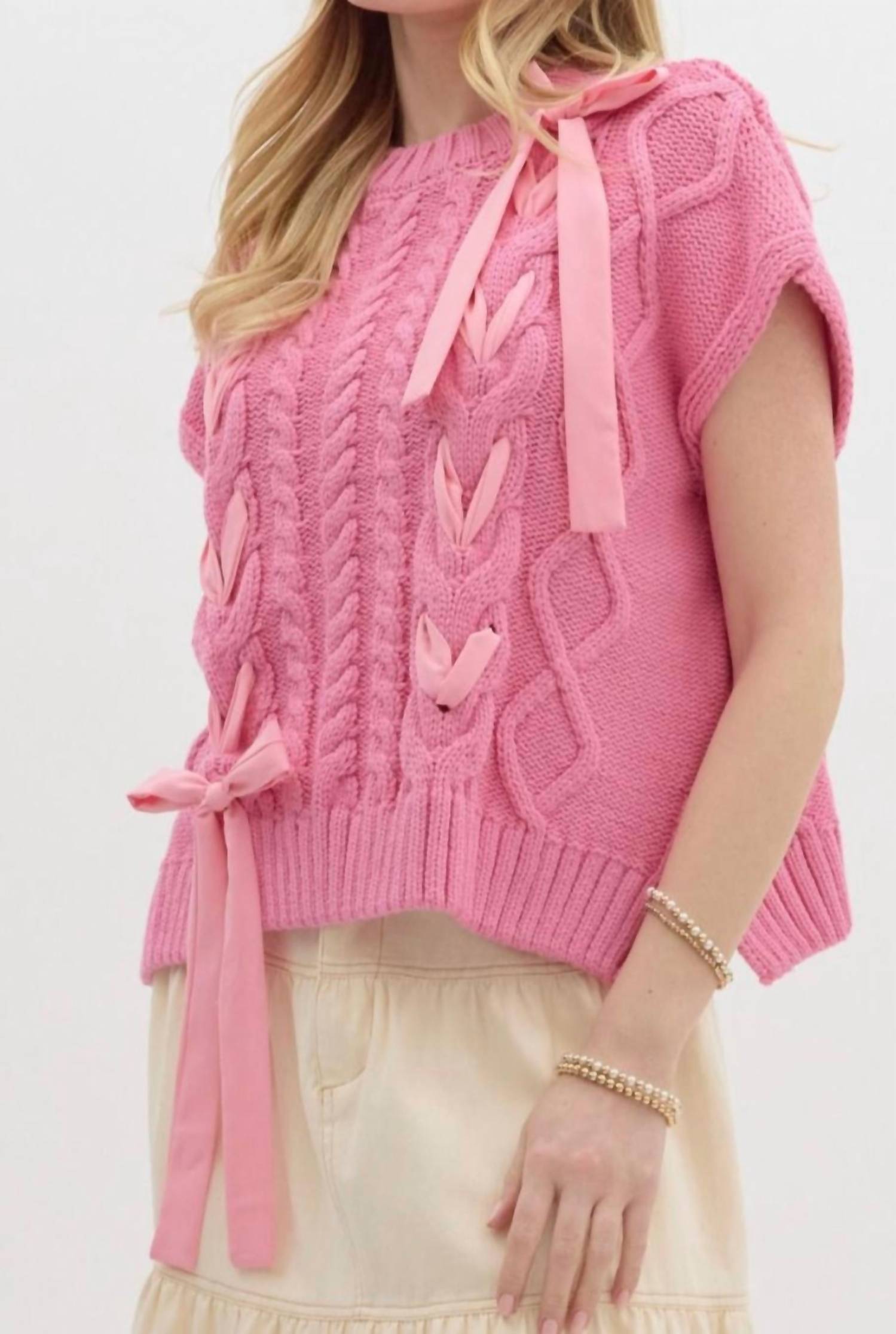 Experience the perfect blend of comfort and style with this trendy crew neck sweater, designed to effortlessly elevate your wardrobe. Pair it with your favorite denim and loafers for the perfect look. Introducing the Ribbon Short Sleeve Sweater by Entro, a delicate cable knit top in soft pink with a charming ribbon lace detail at the front. This lightweight, unlined piece is composed of 60% cotton and 40% acrylic and features a comfortable crew neckline. Designed with a pull-on closure for easy wear, this non-sheer sweater is perfect for layering. Care instructions recommend machine wash, making it both stylish and practical for everyday elegance.
