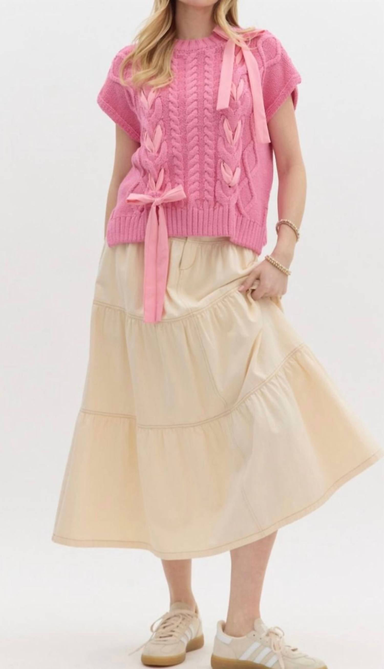 Introducing the Ribbon Short Sleeve Sweater by Entro, a delicate cable knit top in soft pink with a charming ribbon lace detail at the front. This lightweight, unlined piece is composed of 60% cotton and 40% acrylic and features a comfortable crew neckline. Designed with a pull-on closure for easy wear, this non-sheer sweater is perfect for layering. Care instructions recommend machine wash, making it both stylish and practical for everyday elegance.