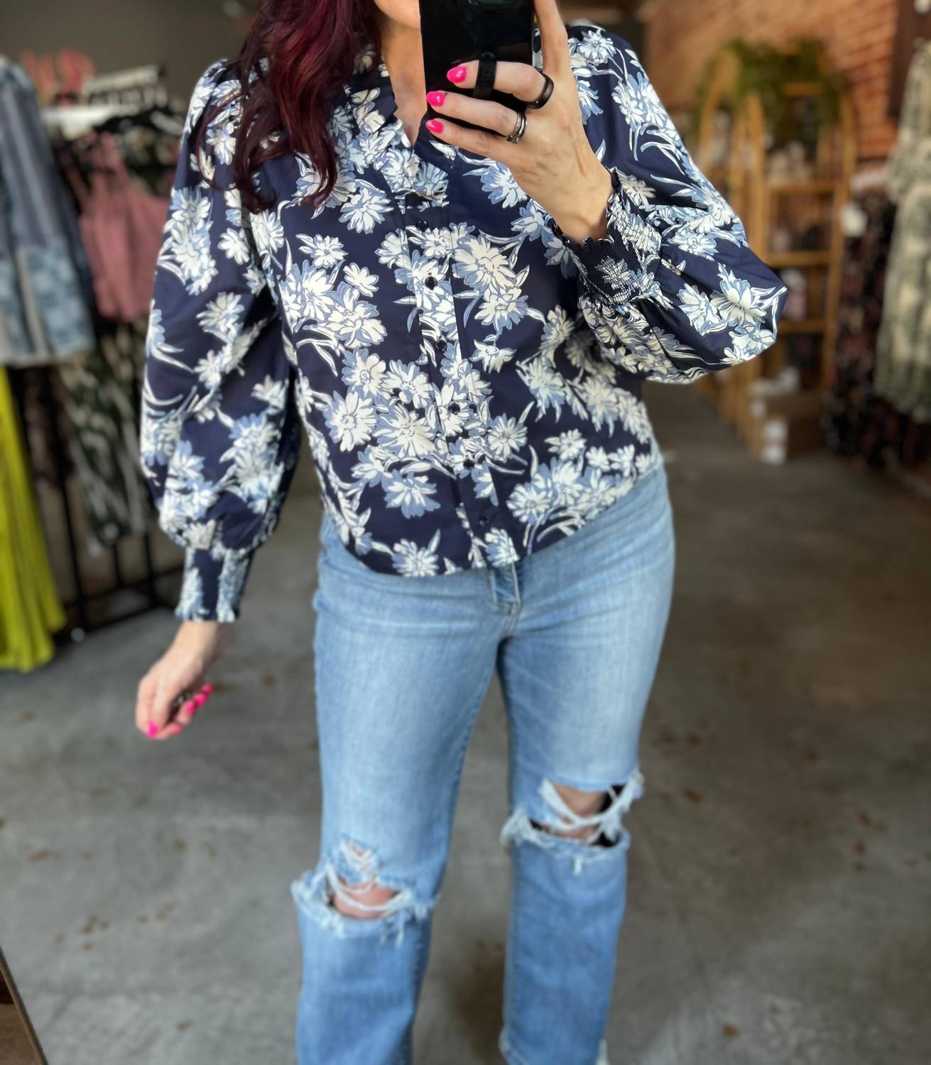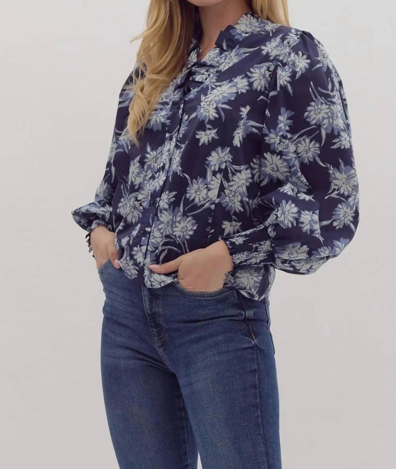 This button down shirt is comfortable yet polished. Charming addition to your spring wardrobe in an elegant navy hue. Button-down poplin blouse features long sleeves with playful ruffle neck details and smocked cuffs. Crafted from 100% cotton for comfort and style. Lightweight and non-sheer fabric ensures a relaxed fit, making it an ideal choice for boho chic looks. Button closure. Hand wash.