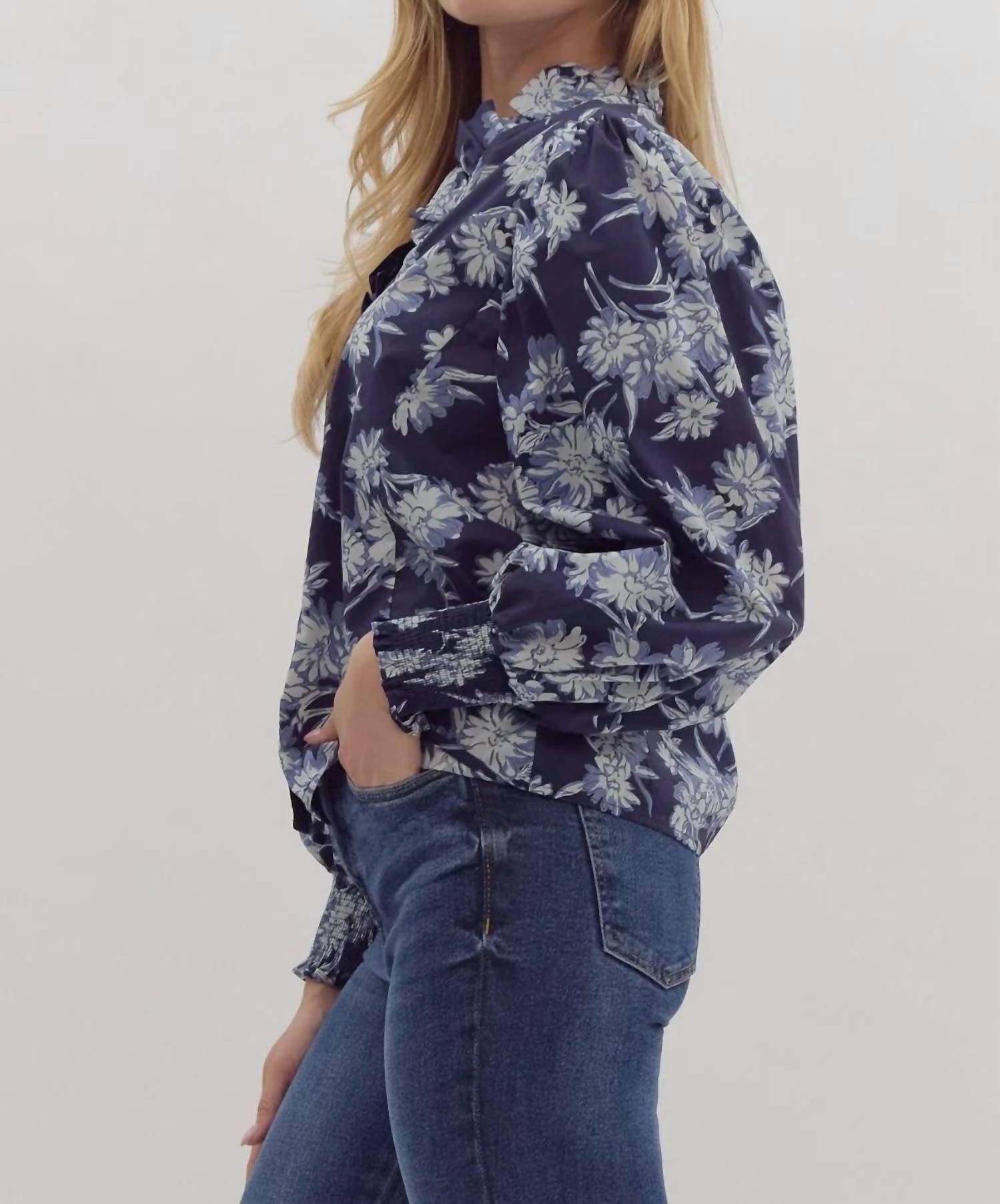 Charming addition to your spring wardrobe in an elegant navy hue. Button-down poplin blouse features long sleeves with playful ruffle neck details and smocked cuffs. Crafted from 100% cotton for comfort and style. Lightweight and non-sheer fabric ensures a relaxed fit, making it an ideal choice for boho chic looks. Button closure. Hand wash.