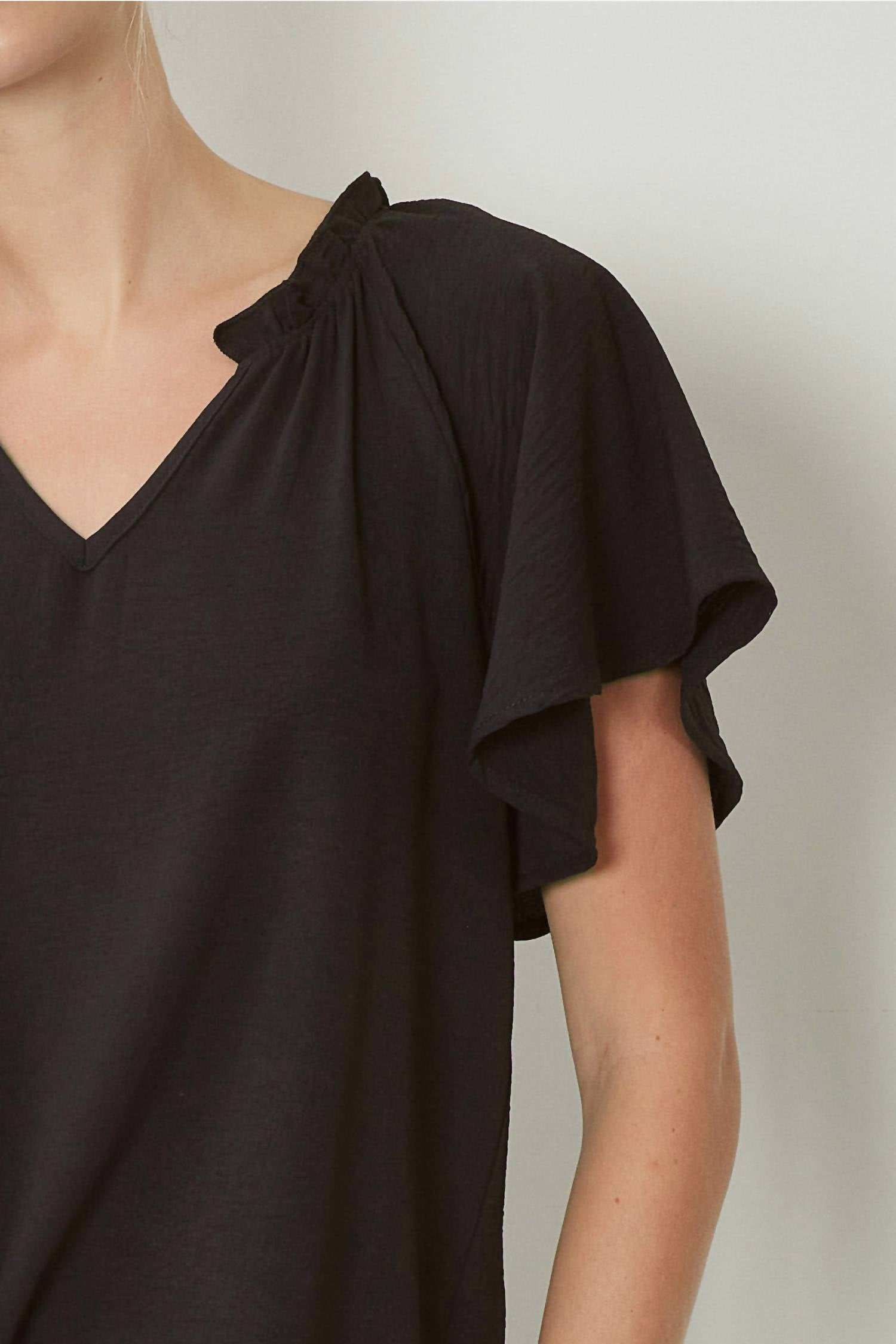 Pair this with your favorite jeans and slides for your next girls night out. Offers a chic and versatile look, perfect for any occasion from work to a beach day. Features short flutter sleeves and a V-neck with ruffle trim. Crafted from 100% textured polyester. Pull-on design complements its lightweight, A-line silhouette. For optimal care, choose hand washing or dry cleaning.