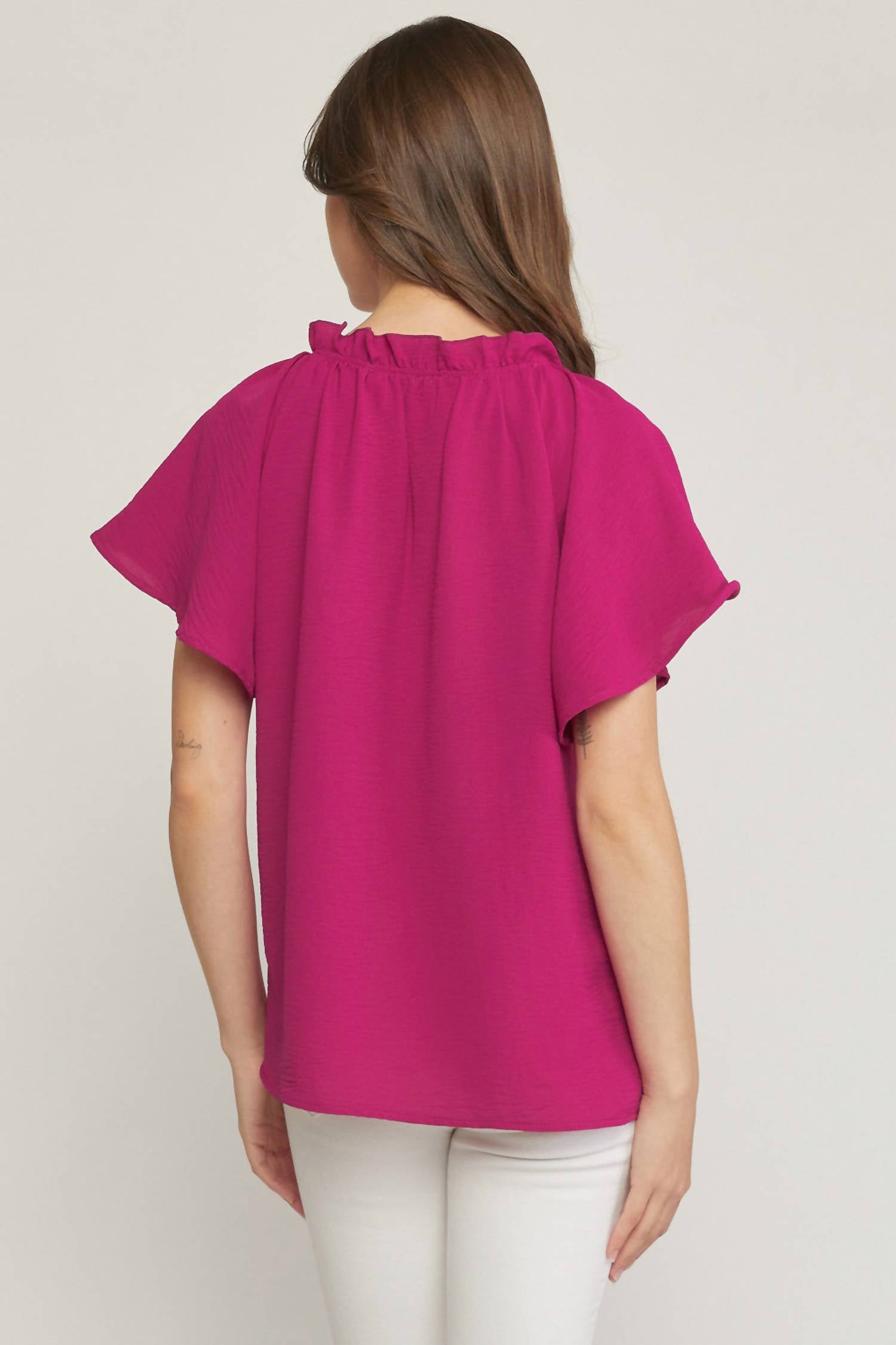 A versatile blouse that works from desk to dinner! Offers a chic and versatile look, perfect for any occasion from work to a beach day. Features short flutter sleeves and a V-neck with ruffle trim. Crafted from 100% textured polyester. Pull-on design complements its lightweight, A-line silhouette. For optimal care, choose hand washing or dry cleaning.