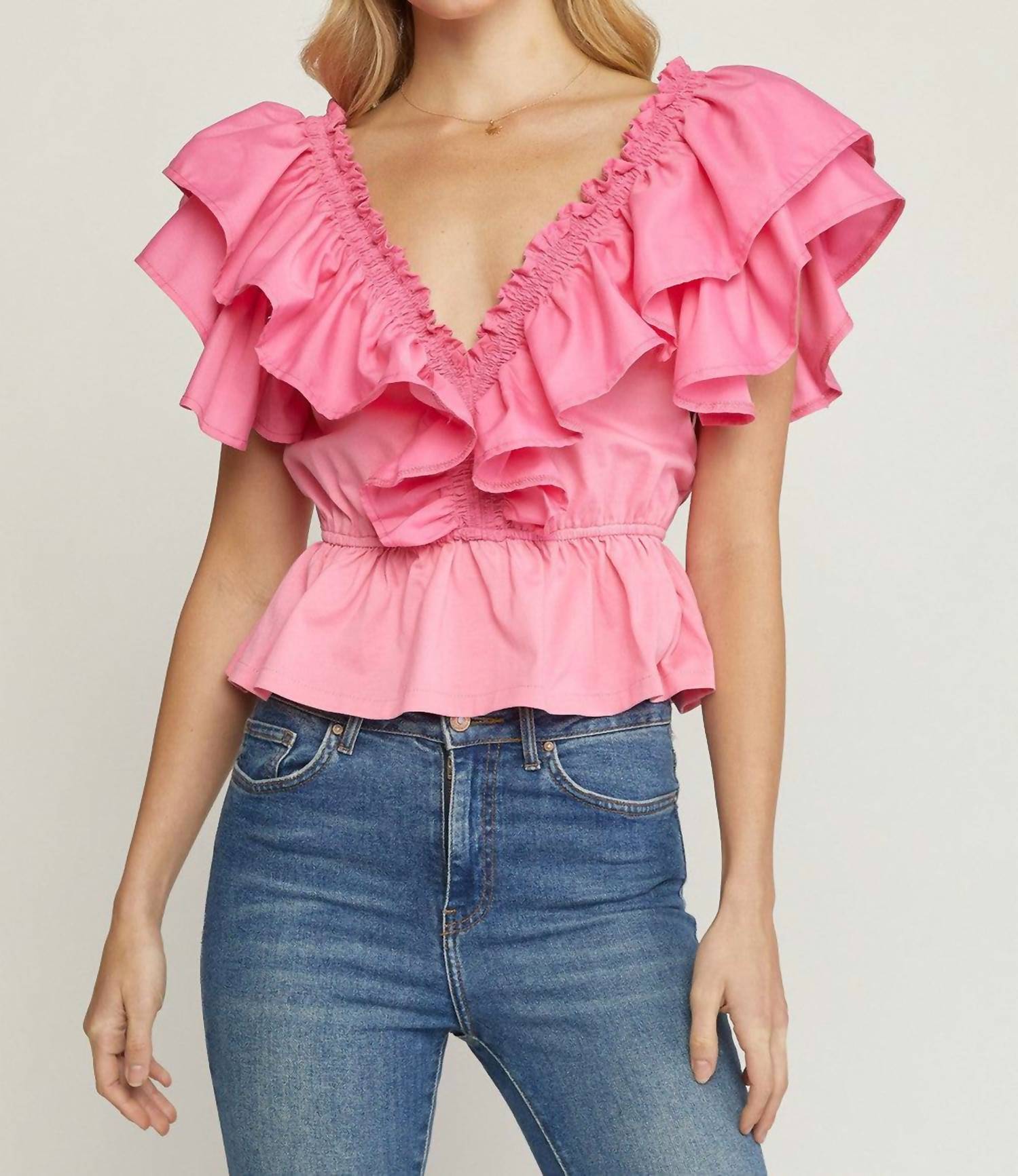 Introducing the Ruffled Peplum Top by Entro, an eye-catching piece in a delightful pink hue. Designed with short ruffled sleeves and a chic V-neckline, this blouse features a V back and elastic waist for a flattering fit. Made from a lightweight blend of 80% Polyester and 20% Cotton, it offers a comfortable wear with a pull-on closure. Care: Hand wash cold. Available in Small (Bust 36", Length 21"), Medium (Bust 38", Length 21"), and Large (Bust 40", Length 21").