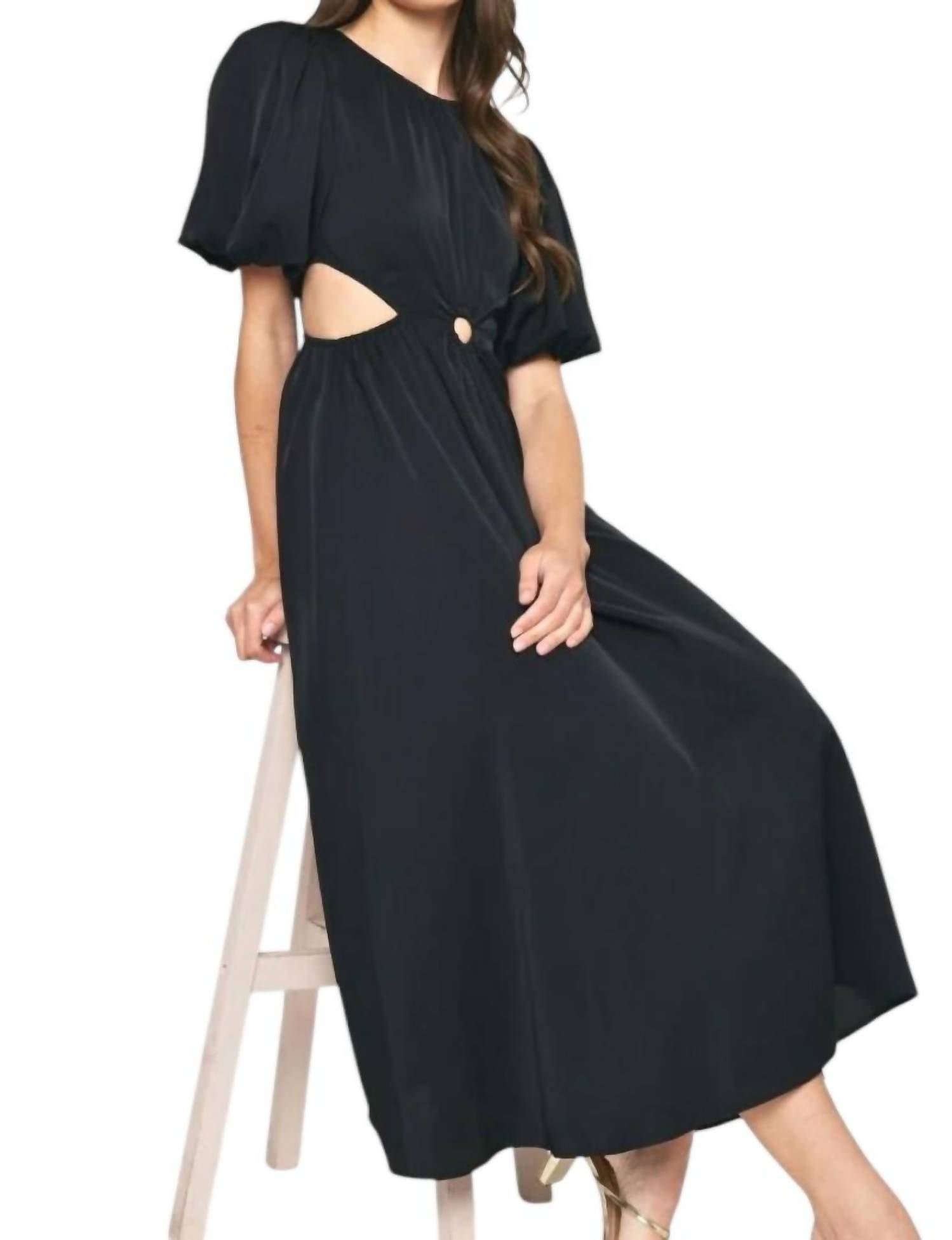 Just add slides or mules and you are good to go. Introducing the Sade Sides Cut-Outs Puff Sleeves Maxi Dress by Entro, a chic addition to any sophisticated wardrobe in timeless black. This dress highlights short puff sleeves and subtle side cutouts, with a zip closure for a seamless fit. Made from 100% Polyester and fully lined, it ensures both comfort and style. Care instructions include hand washing in cold water and line drying to maintain its elegance. Imported for a truly refined presence at any evening affair.