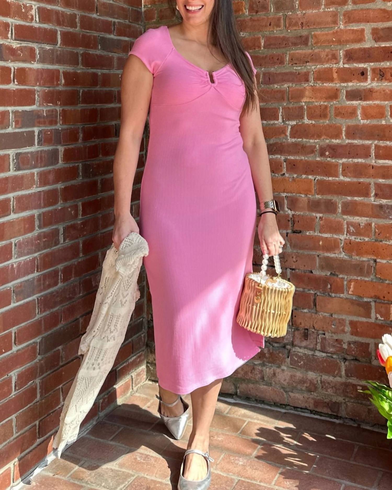 The perfect length dress does exist. Embrace your curves with the Sally Bodycon Dress by Entro, a sophisticated choice for special occasions. This short sleeve dress in a delicate baby pink hue features a scoopneck and ribbed, non-sheer material that molds to your silhouette for a fitted style. As a midi-length dress in a solid pattern, it's designed for effortless elegance, ideal for summer festivities. Closure: Pull on. For the best fit, size up if you are in-between sizes.