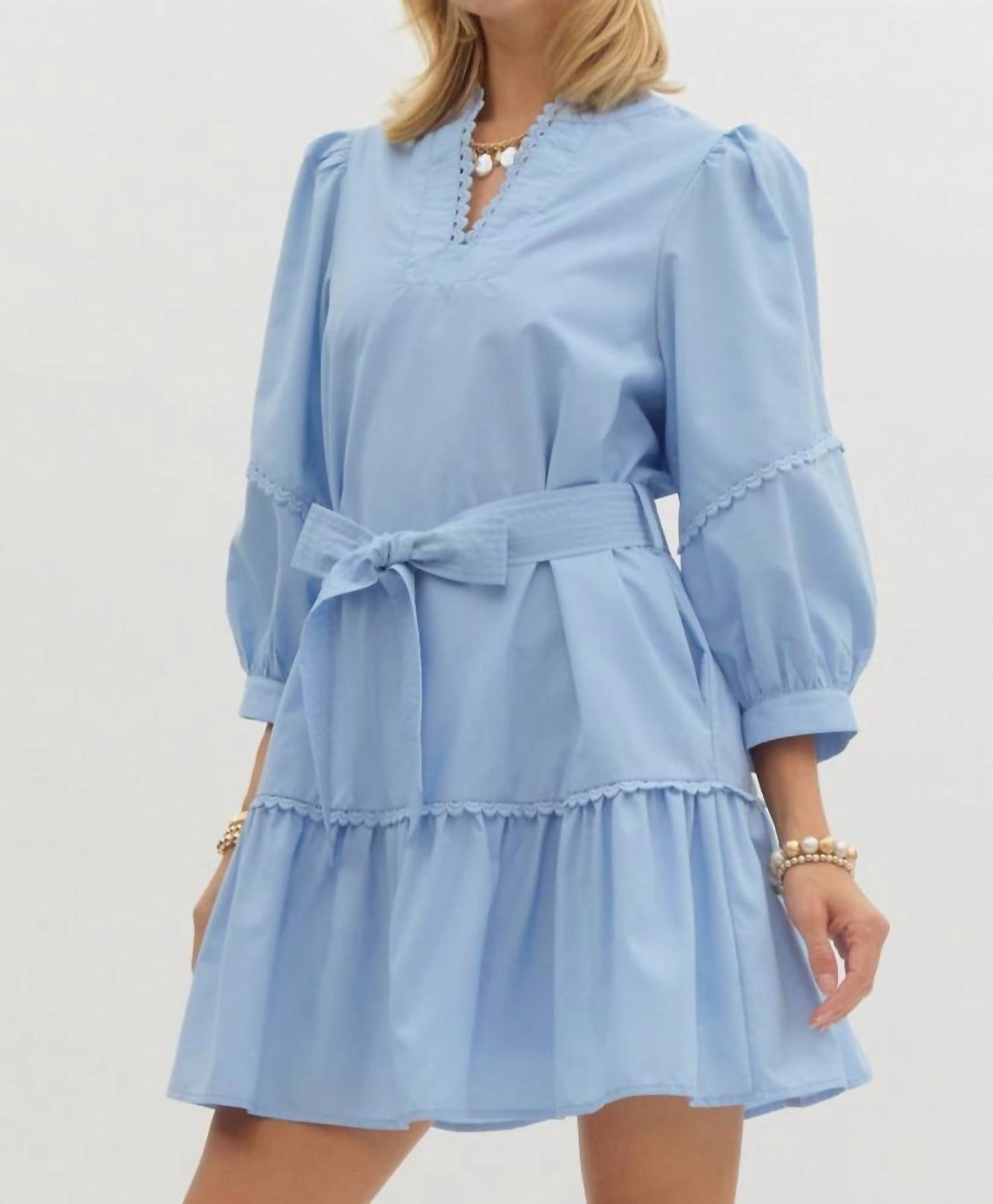 The perfect mini dress for those warmer months. Introducing the Scallop Trim Mini Dress by Entro, a perfect blend of minimalism and style for your summer wardrobe. This light blue mini dress features a V-neck and three-quarter sleeves with an elegant scallop trim, crafted from a cotton blend material. Designed with an A-line silhouette, it includes a removable tie closure belt at the waist and convenient side pockets. Effortlessly lined and lightweight, it's perfect for any vacation or Thanksgiving occasion.