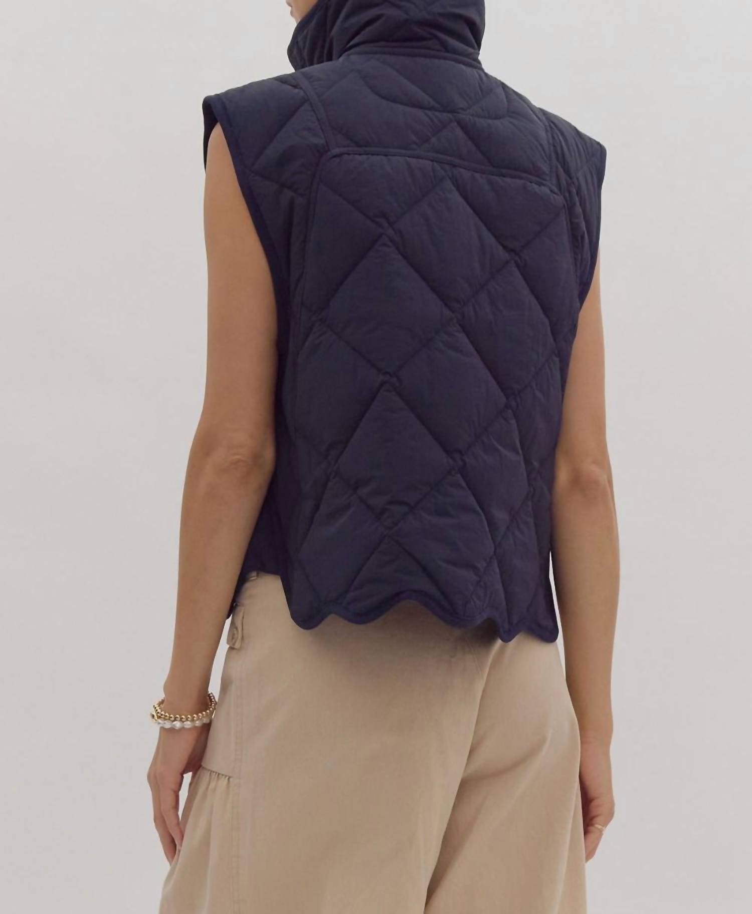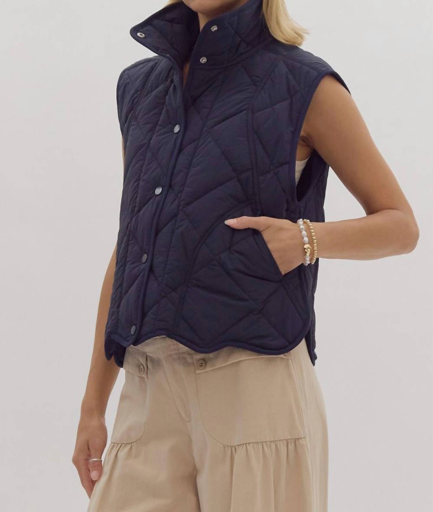This sleeveless vest is crafted from 100% Nylon, ensuring a lightweight feel without compromising on style. Designed with a practical snap closure and convenient side pockets, it features a charming scalloped hem for a touch of flair. The color and unlined, non-sheer woven construction make it the perfect addition over a fitted long sleeve top.