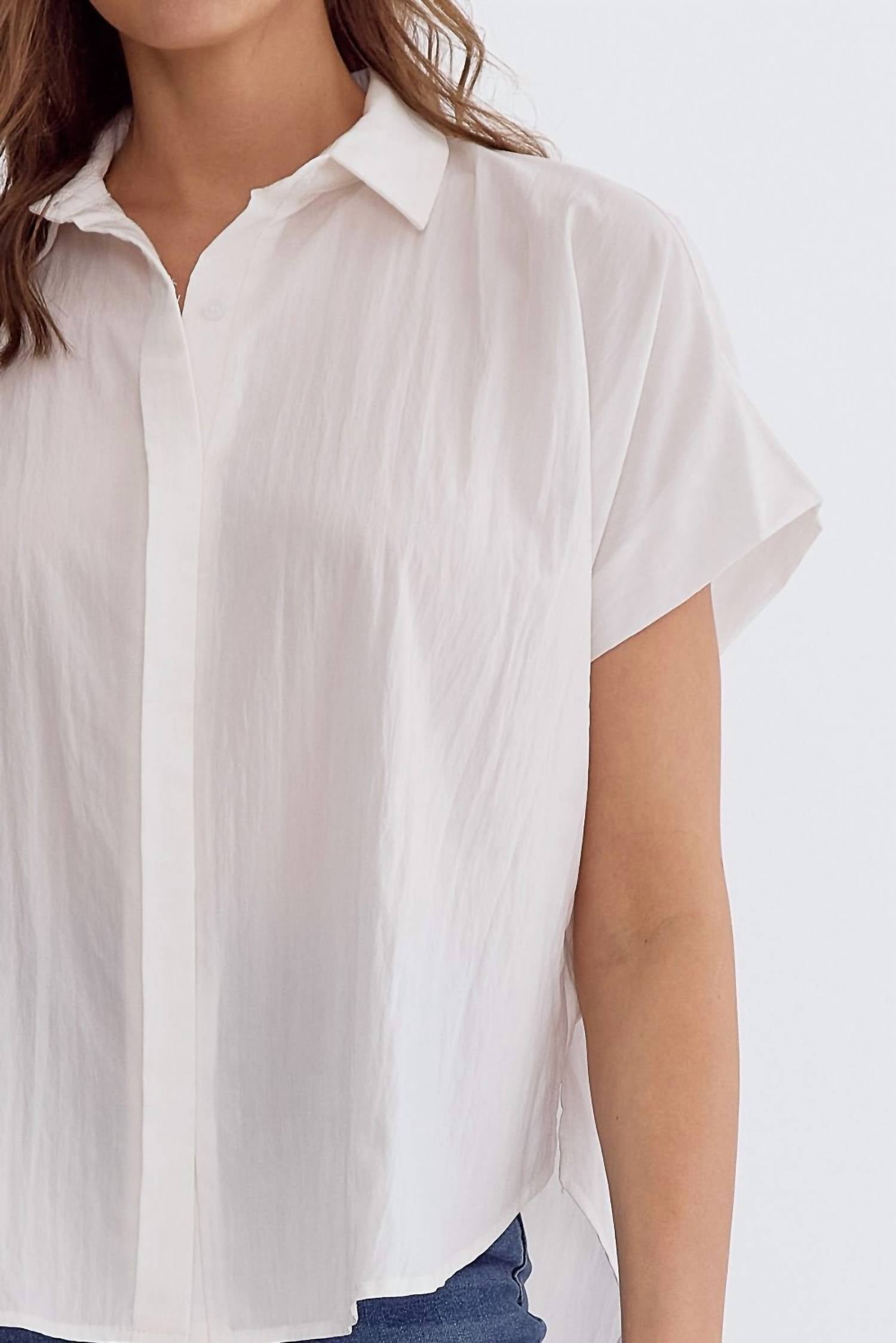 This button down shirt is comfortable yet polished. Offers an effortless blend of style and comfort. Featuring short sleeves and a classic collar. Solid off-white button-down shirt exudes timeless elegance. Closure comes easy with a button closure. Crafted to keep you looking chic without compromise.