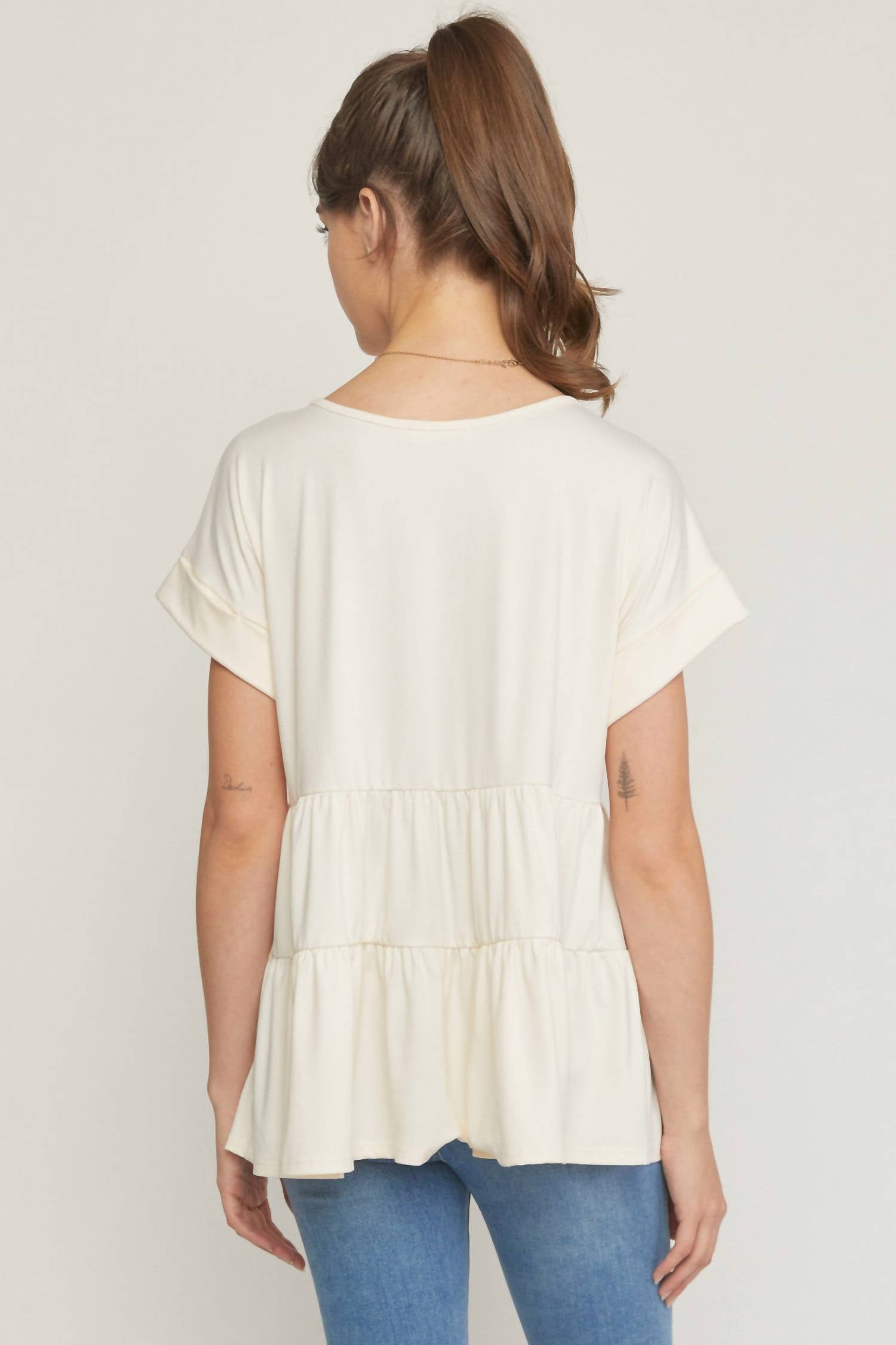 Discover the versatile charm of this tunic blouse, designed with both layering and standalone wear in mind. Its flattering silhouette and stylish details make it a closet essential. Introducing the Short Sleeve Tiered Tunic by Entro, a charming and versatile addition to your wardrobe in a delicate cream hue. This tunic features short sleeves with permanent rolled cuffs, a comfortable crewneck, and a tiered bodice in a lightweight, oversize silhouette. With its soft, stretchy fabric composition of 94% polyester and 6% spandex, it offers both comfort and style. Made in the USA, this tunic is a pull-on design and is best cared for with hand washing or dry cleaning. Available in sizes with busts ranging from 42" to 54" and lengths from 27" to 29".