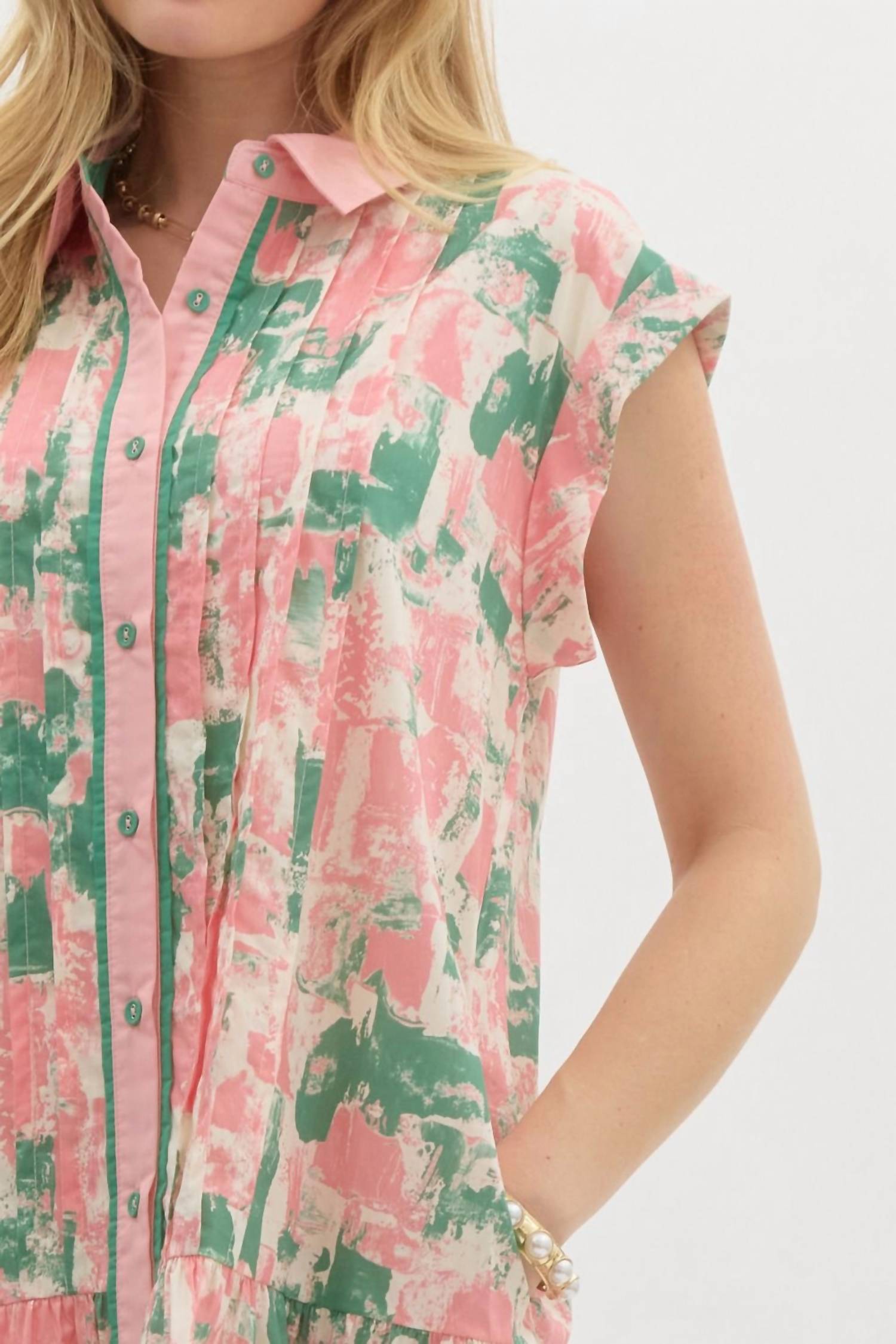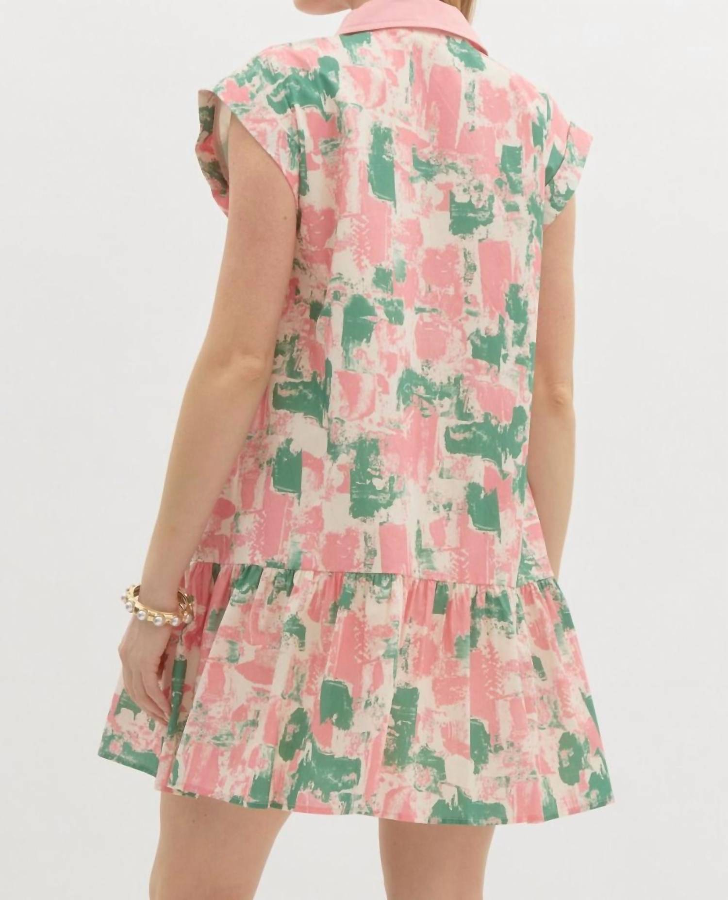 The perfect mini dress for those warmer months. Presenting the Sleeveless Mini Dress by Entro, an artistic piece with a floral abstract pattern in pastel hues. This lightweight A-line dress features pintuck details at the front and a front button closure accentuated with contrasting binding. Crafted from 100% cotton, it offers a non-sheer, woven design. Care instructions recommend machine wash. Complete with a stylish collar, this dress is perfect for Easter celebrations.