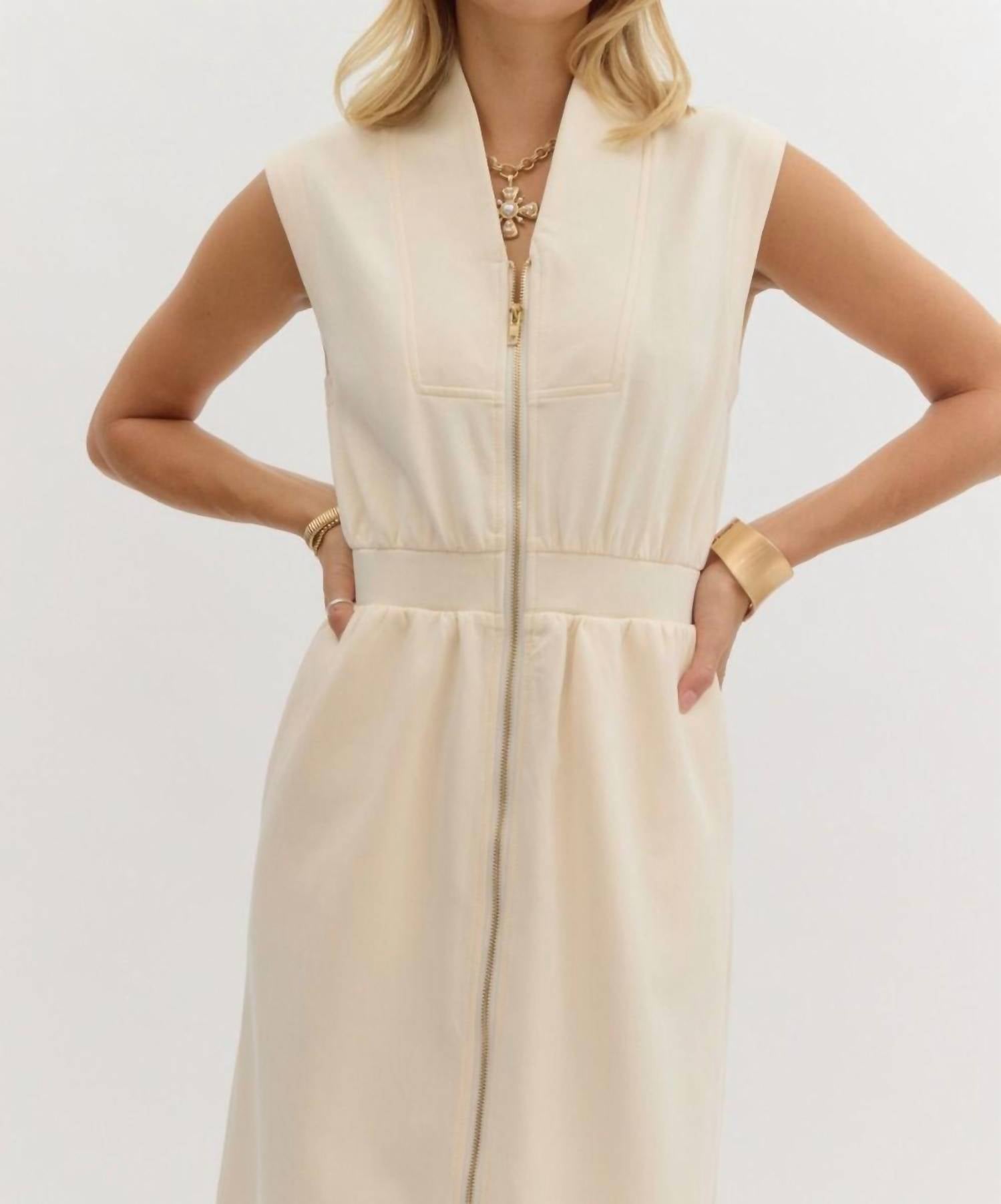 Elevate your travel wardrobe with the Sleeveless Zip Up Midi Dress by Entro in a calm cream hue, perfect for a touch of quiet luxury. This cotton blend A-line dress features a practical zip closure, collar neckline, and the convenience of side pockets. Hitting at a midi length, it's unlined, non-sheer, and lightweight, making it ideal for fall outings including Thanksgiving gatherings. Made from 50% Cotton, 43% Polyester, 7% Spandex. Care is hassle-free: simply machine wash and line dry. Available bust measurements: small 36", medium 38", large 40"; length for all sizes: 47".