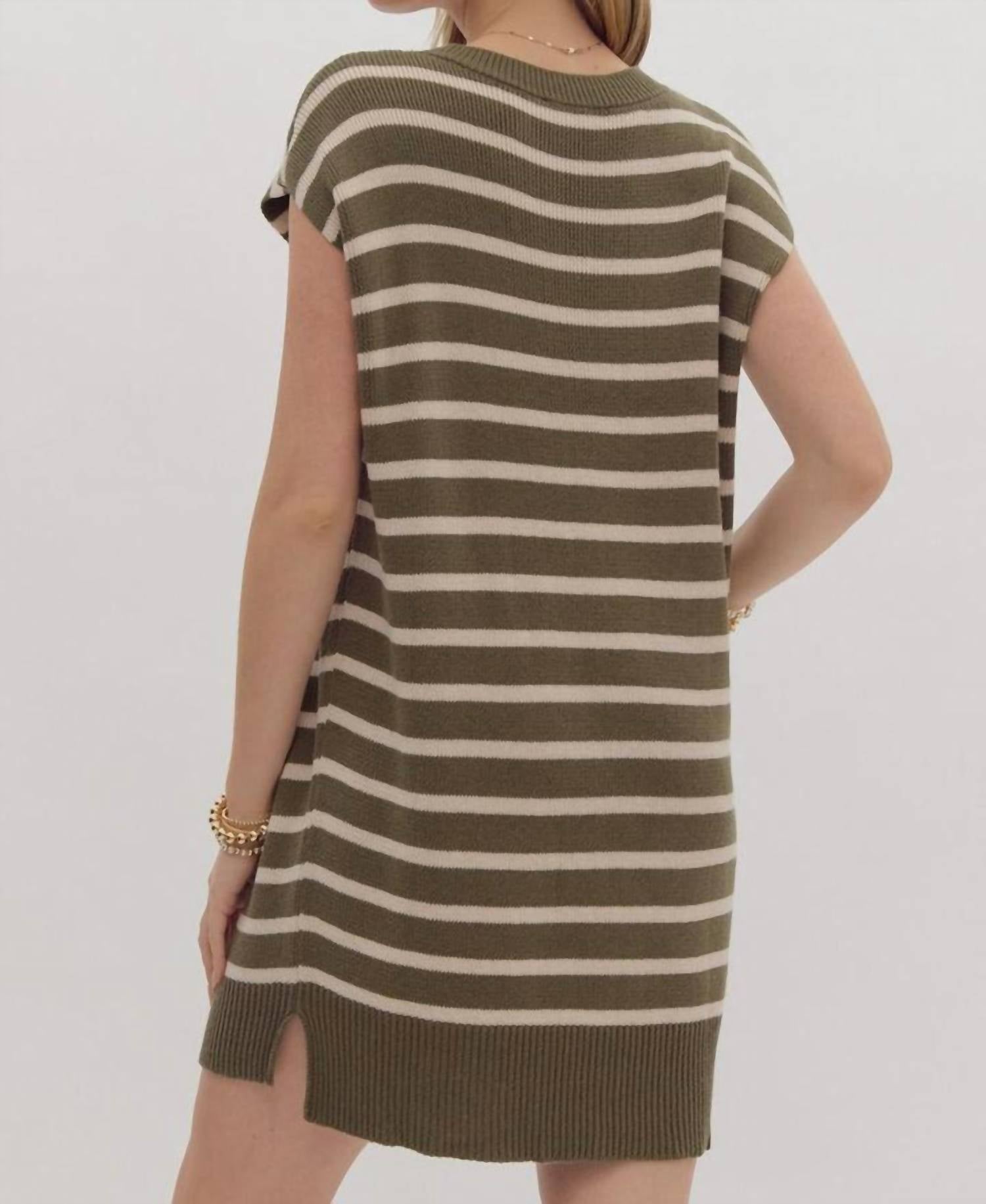 Introducing the Slit Stripe Dress by Entro, a playful and versatile piece in an eye-catching olive stripe pattern. This mini dress features cap sleeves and a crewneck, complete with slits at the sides for adaptable styling and a pocket detail at the bust. Crafted from 55% Acrylic and 45% Cotton, the dress offers a lightweight feel and the convenience of a pull-on closure. Hand wash and lay flat to dry.