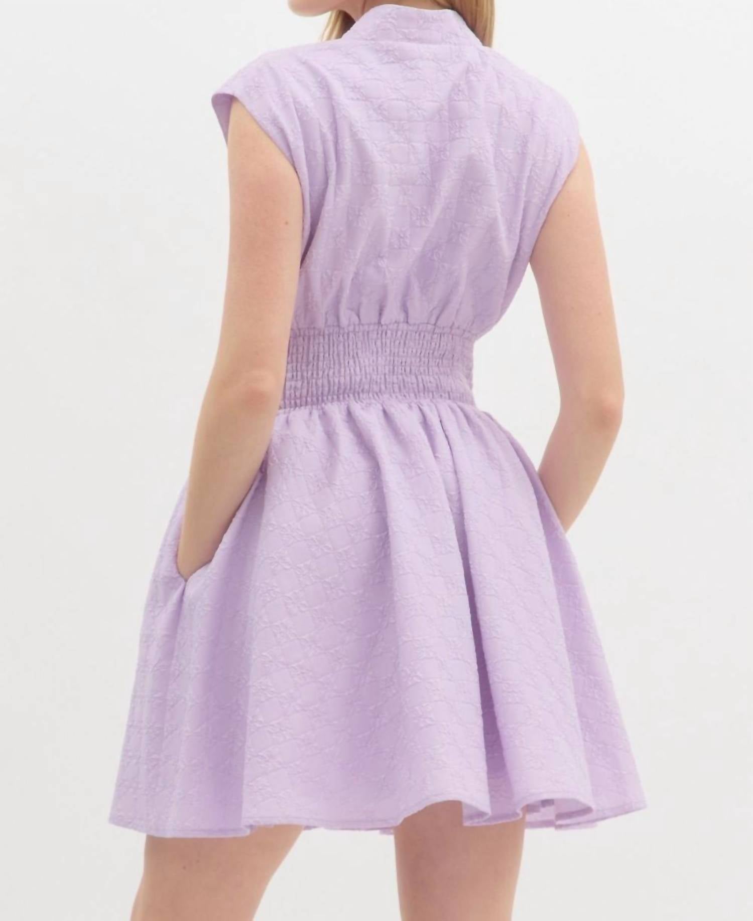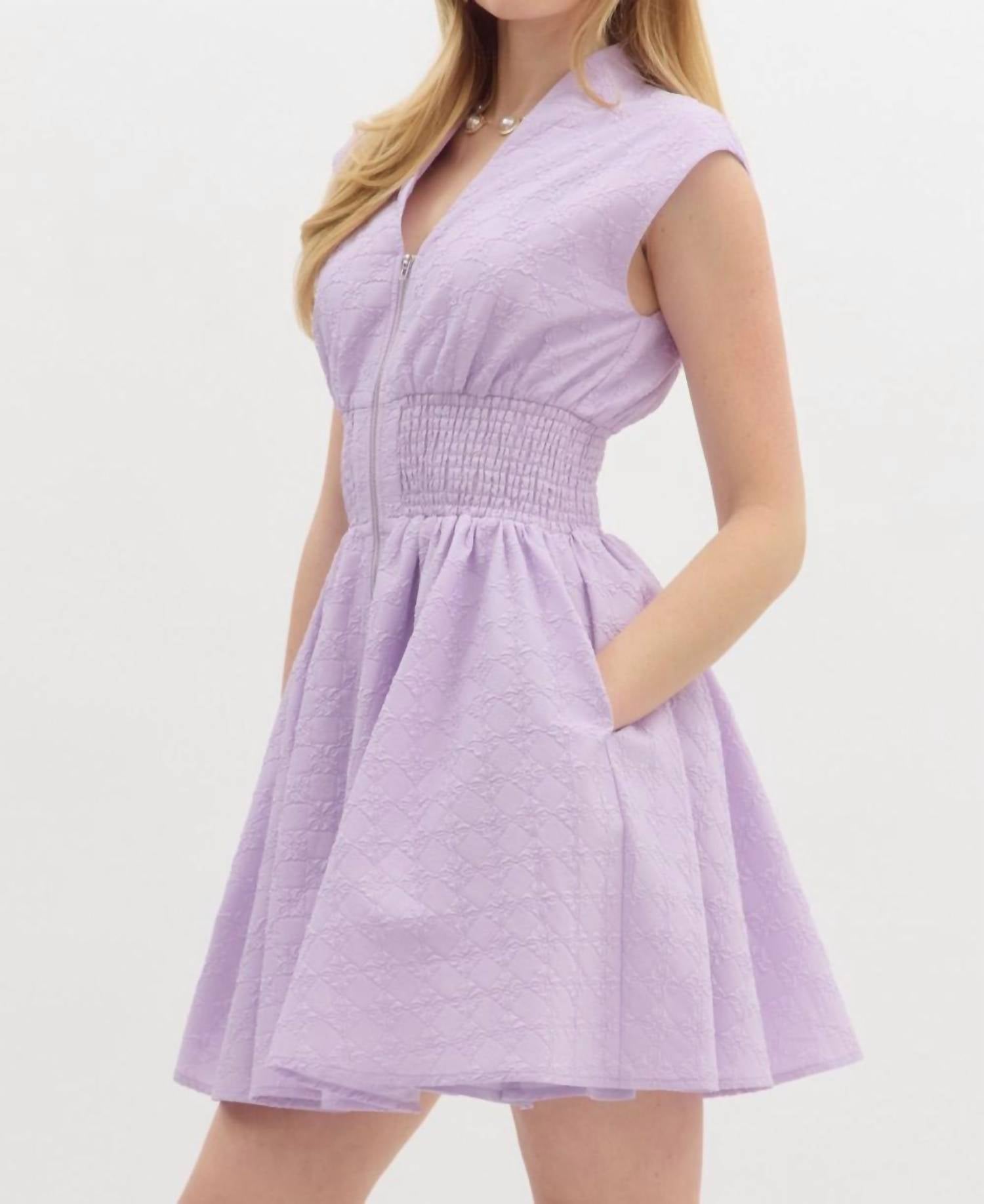 The perfect mini dress for those warmer months. Meet the Something Extra Mini Dress by Entro, where style meets comfort in stunning purple. This sleeveless A-line dress, featuring a textured solid floral diamond pattern jacquard, is perfect for any occasion. Made from 100% polyester, it includes a convenient front zip closure, smocking at the waist, and pockets at the sides. The lightweight, non-sheer design ensures you stay cool and stylish, while the V-neckline adds a touch of elegance.