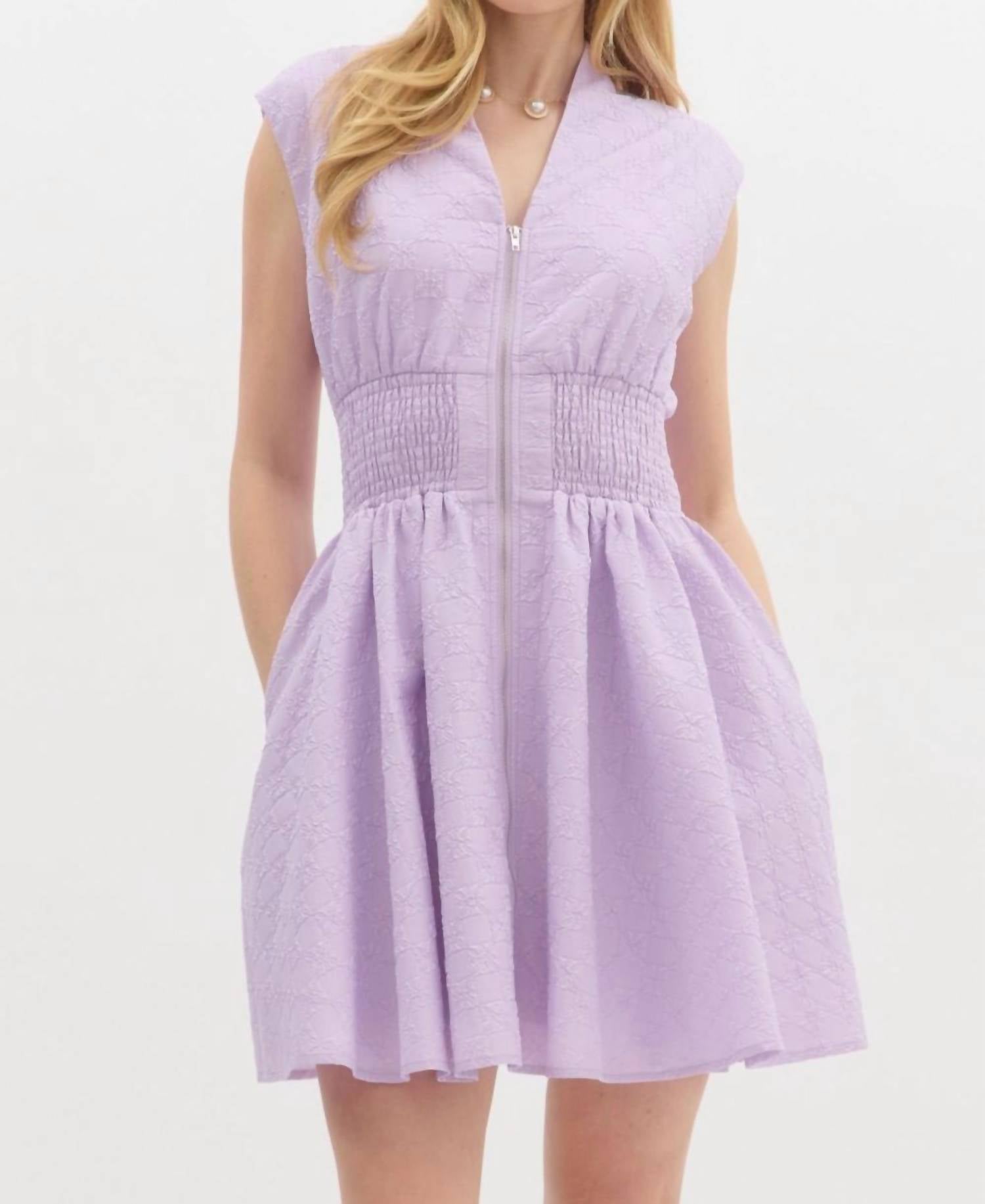 Meet the Something Extra Mini Dress by Entro, where style meets comfort in stunning purple. This sleeveless A-line dress, featuring a textured solid floral diamond pattern jacquard, is perfect for any occasion. Made from 100% polyester, it includes a convenient front zip closure, smocking at the waist, and pockets at the sides. The lightweight, non-sheer design ensures you stay cool and stylish, while the V-neckline adds a touch of elegance.