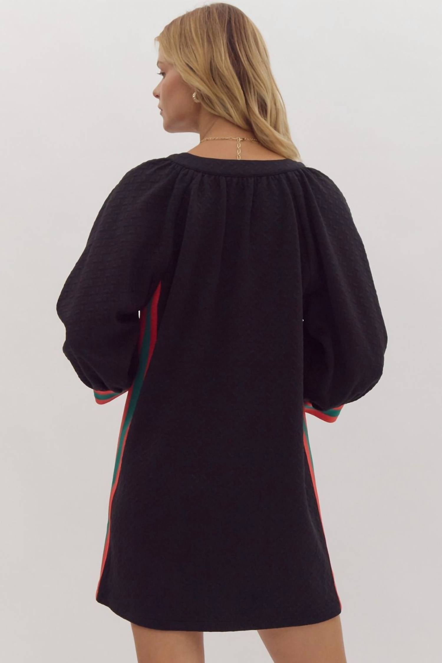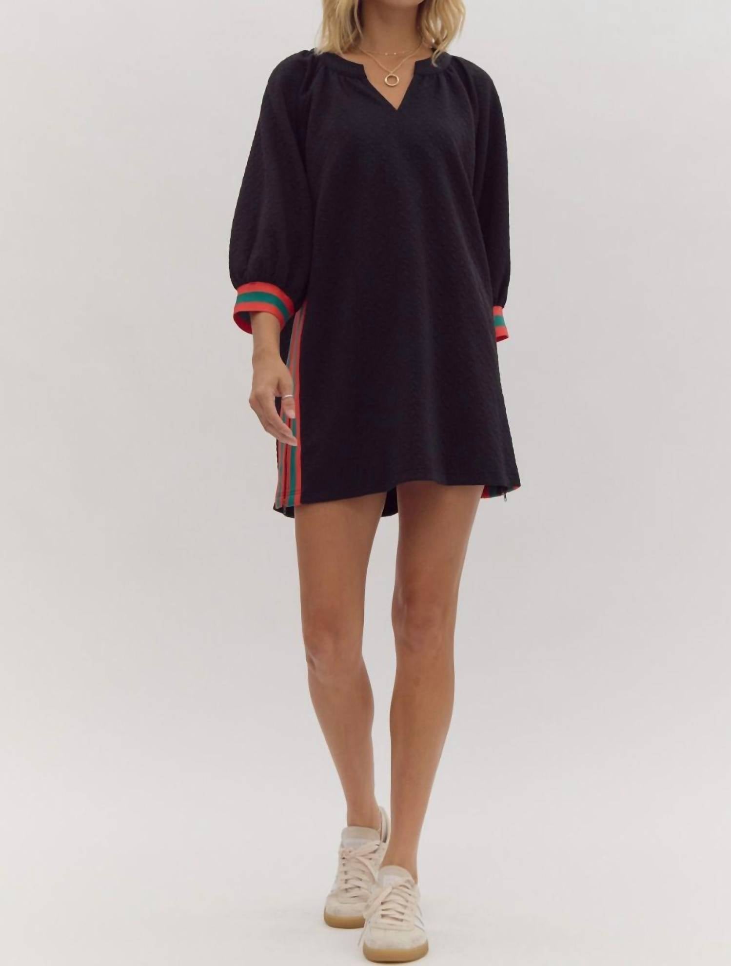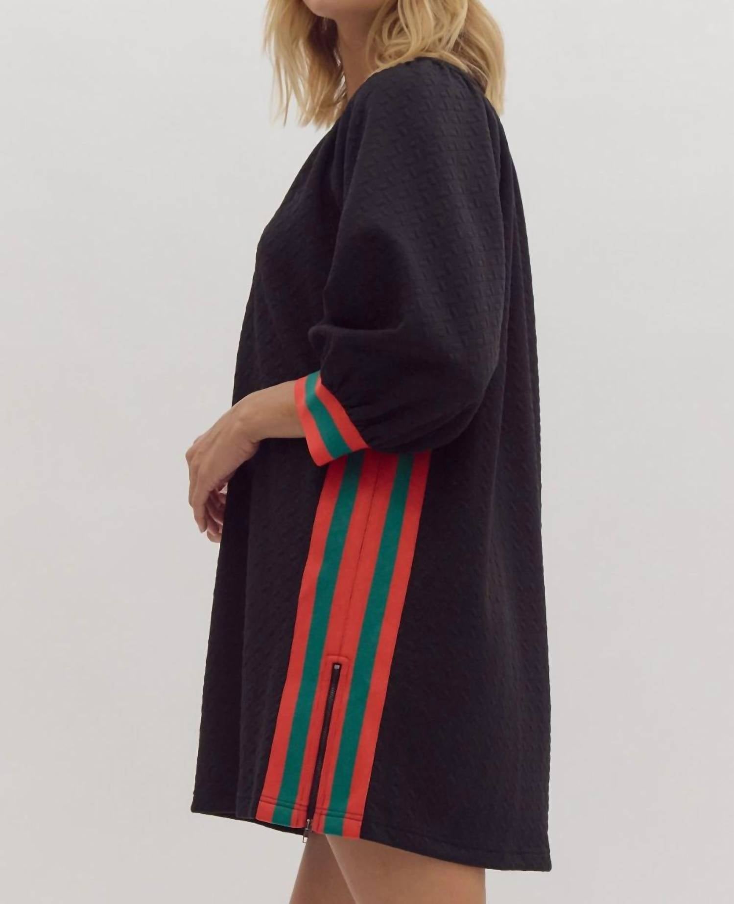 A short and breezy dress for those warmer days. Meet the Entro Sporty Side Stripe Pullover Mini Dress, a standout piece in timeless black. Designed with ¾ raglan sleeves, this textured embossed knit dress brings together a playful athletic-chic vibe, accentuated by multicolor striped rib bands along the sides and sleeves. Crafted from a soft, stretchy composition of 95% Polyester and 5% Spandex, it offers a comfortable pullover fit with a side hem zipper for stylish detail. Care for this dress by hand washing cold or using the gentle cycle, and lay flat to dry to maintain its cozy, lightweight appeal. Model Shea, 5'1", is stunning in size L.