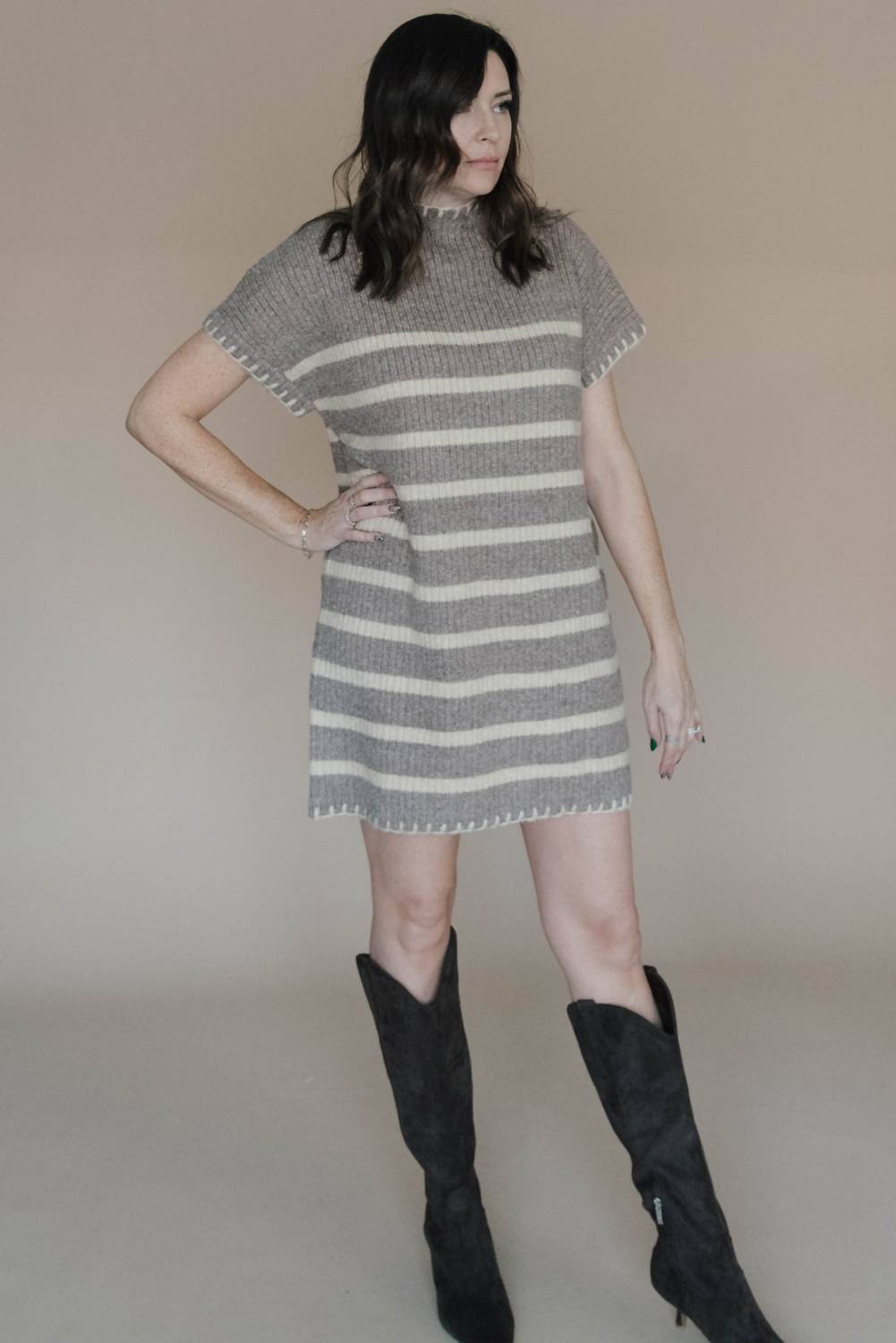 The kind of easy and flattering dress you'll be reaching for all season long. Chic stripe mini dress. Features cap sleeves, a polyester composition, and a stylish mock neckline. Designed with a convenient pull-on closure. Offers a carefree, unlined silhouette. Care for this unique piece with a simple hand wash.