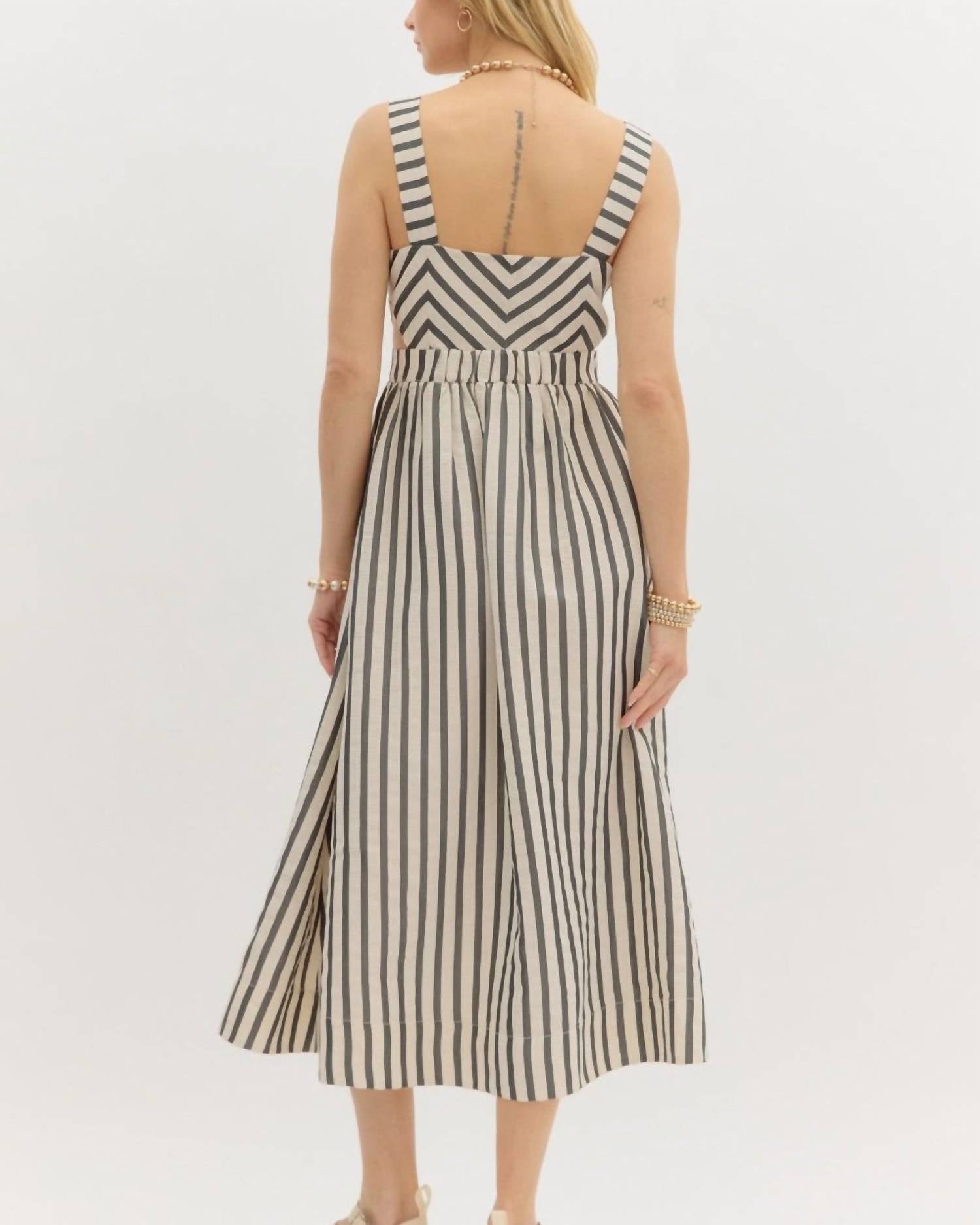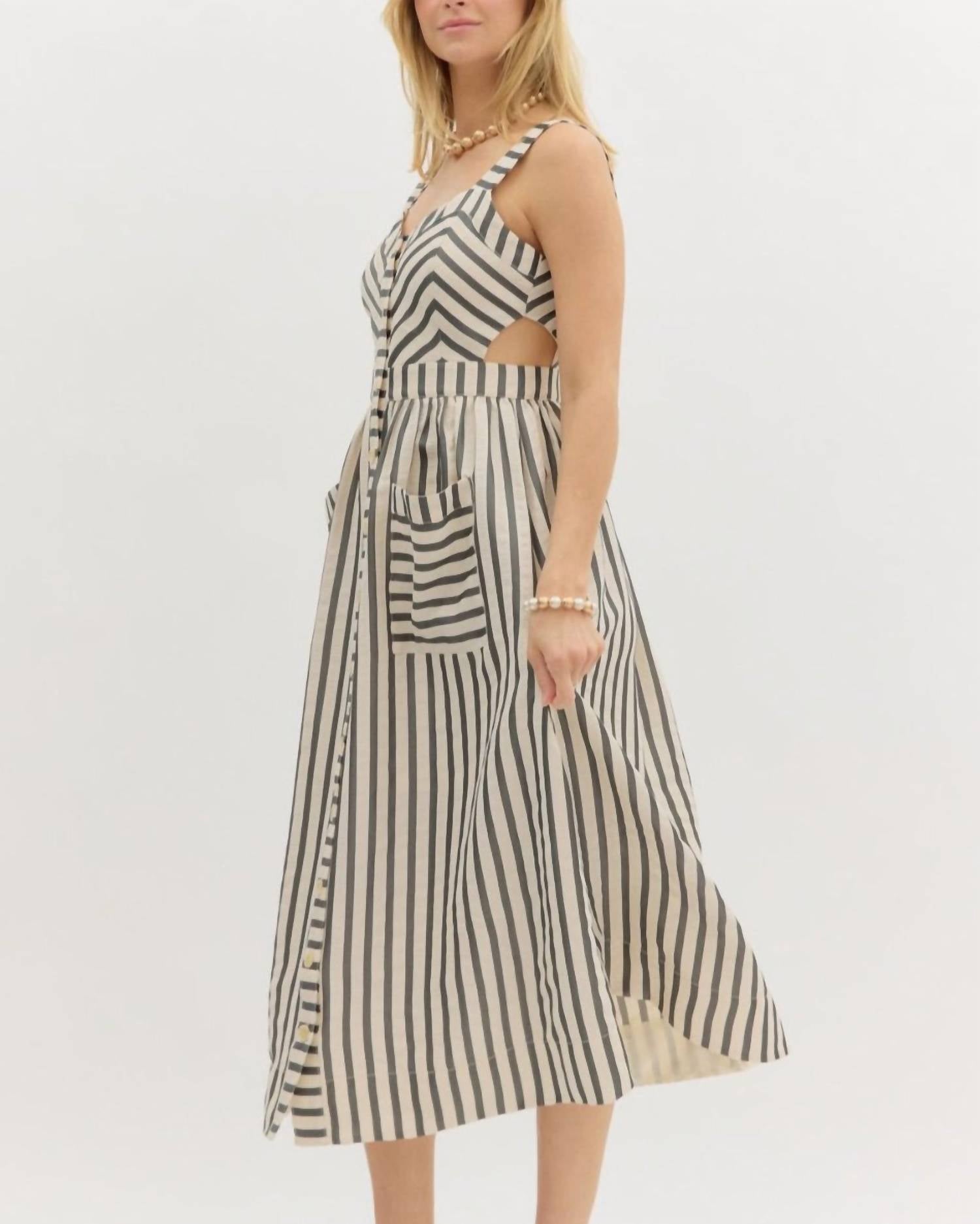 Just add slides or mules and you are good to go. The Stripe Midi Dress by Entro is a chic choice for any dinner party, featuring a sleeveless A-line silhouette in sophisticated black. Crafted from 100% Polyester, this dress boasts convenient pockets and a flattering V-neckline. Closure: Button closure. Perfect for spring workwear or elegant evenings out.