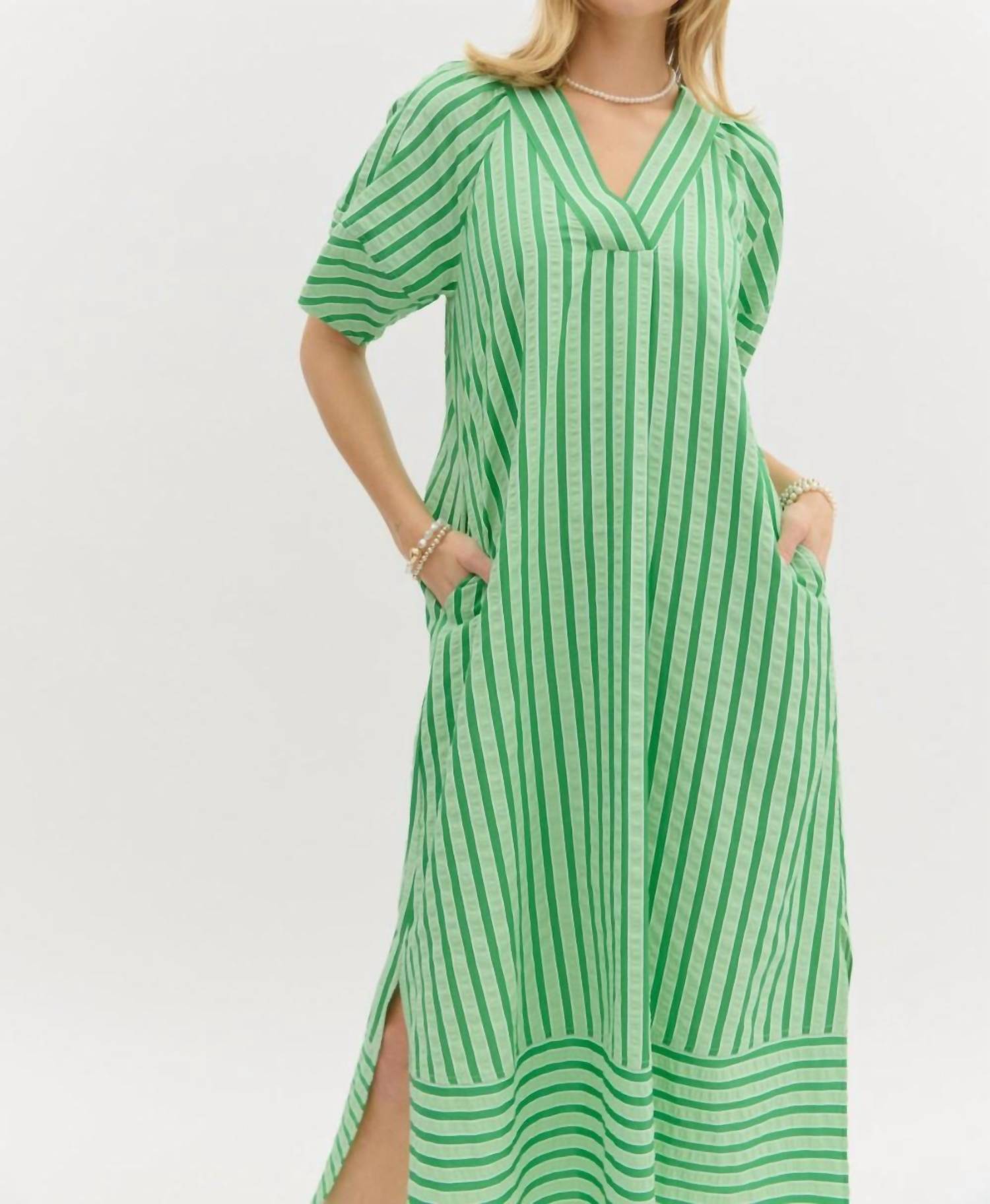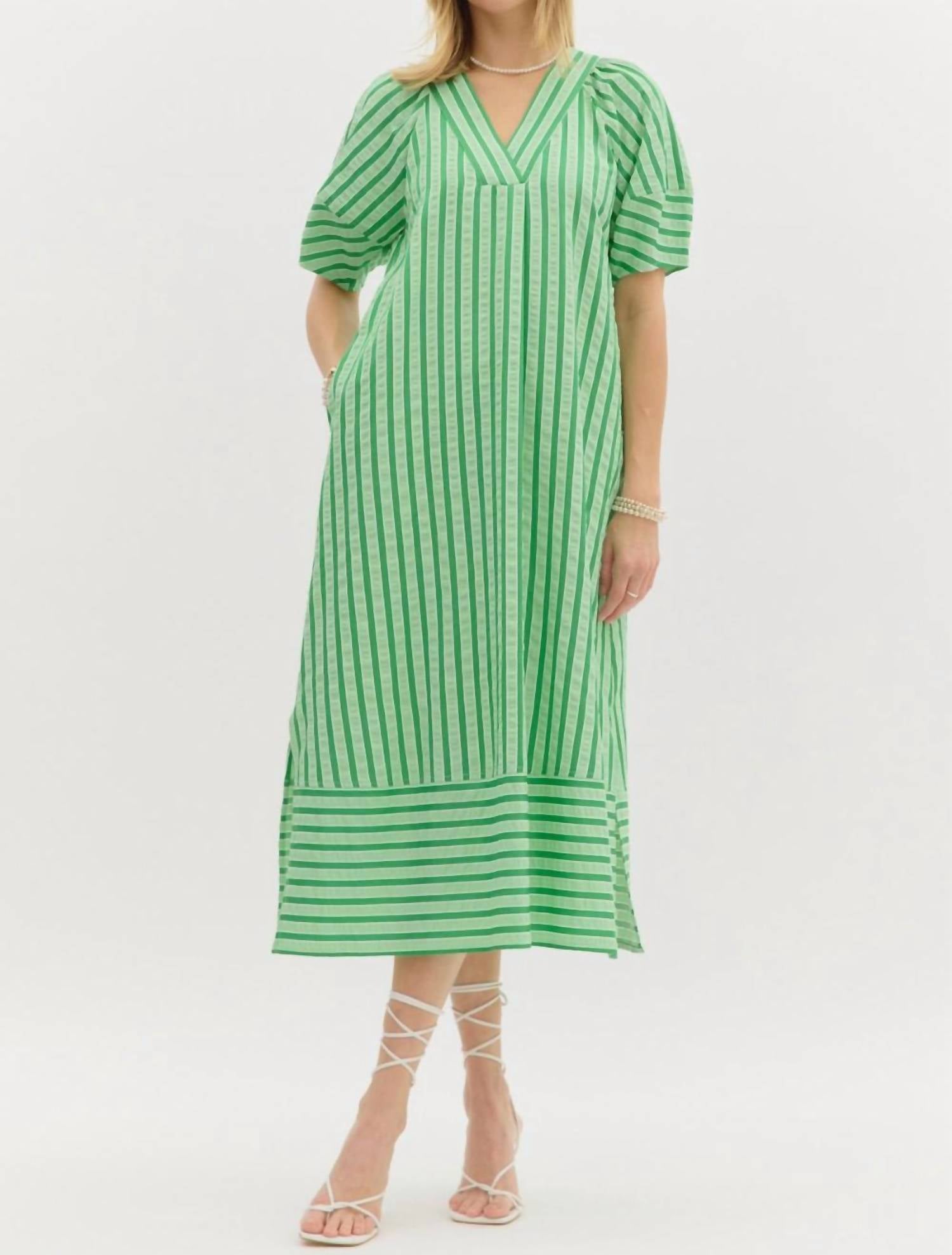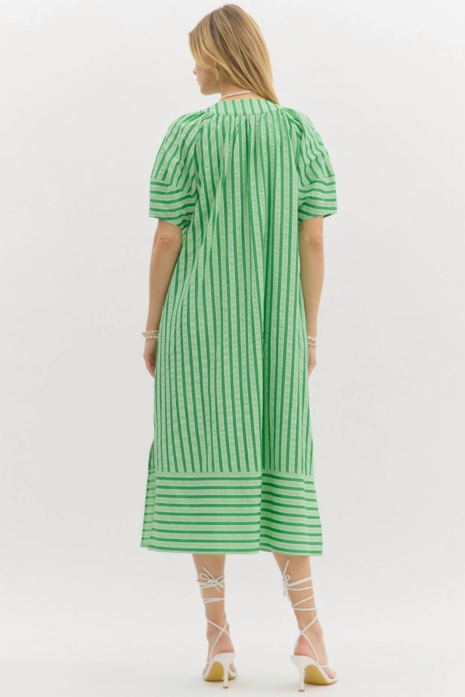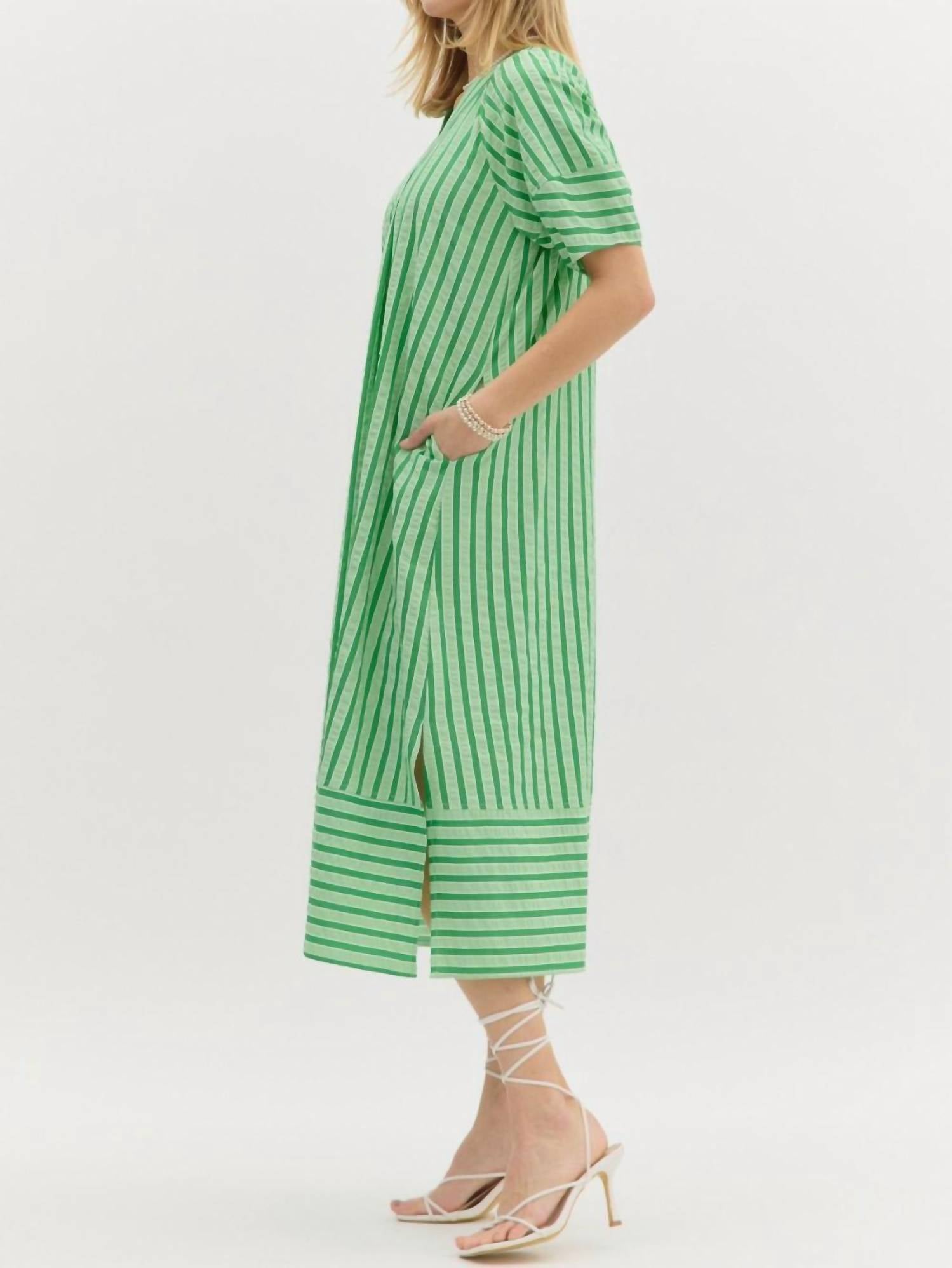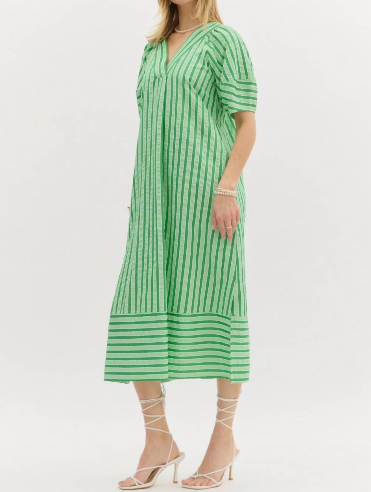 Discover the Stripe Midi Dress by Entro, a charming pistachio piece perfect for St. Patrick's Day festivities. Designed with short sleeves and a flattering V-neck, this dress offers a loose fit and a playful alternating stripe hem. Made from cotton, it features convenient pockets and a pull-on closure. For care, hand wash and line dry to maintain its vibrant appeal. 100% Cotton.