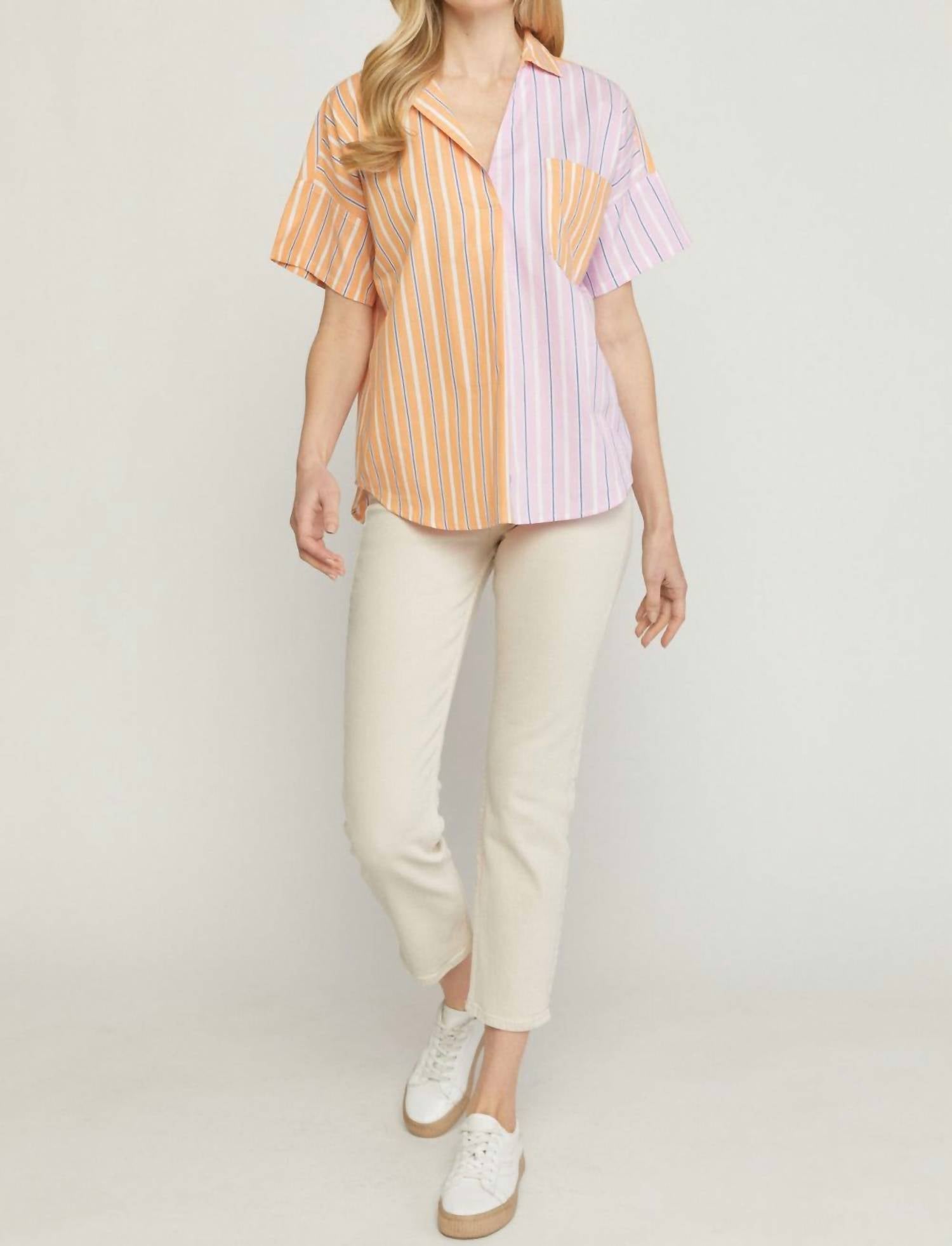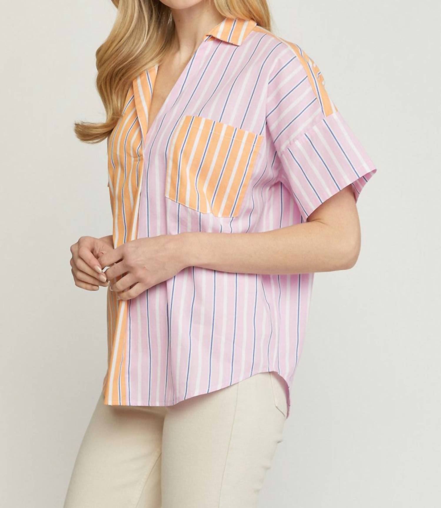 A versatile blouse that works from desk to dinner! Meet the Striped Color Block Top by Entro, a vibrant addition to your wardrobe featuring a playful mix of pink, orange, white, and blue. With short sleeves and a dropped shoulder design, this oversized fit top showcases a collared v-neckline and button detailing on the back. Made from 100% Cotton, it offers a lightweight feel and a stylish pullover closure. Care: Hand wash or dry clean, line dry. Available in multiple sizes: Small (Bust 46", Length 26") to 2X (Bust 54", Length 29").