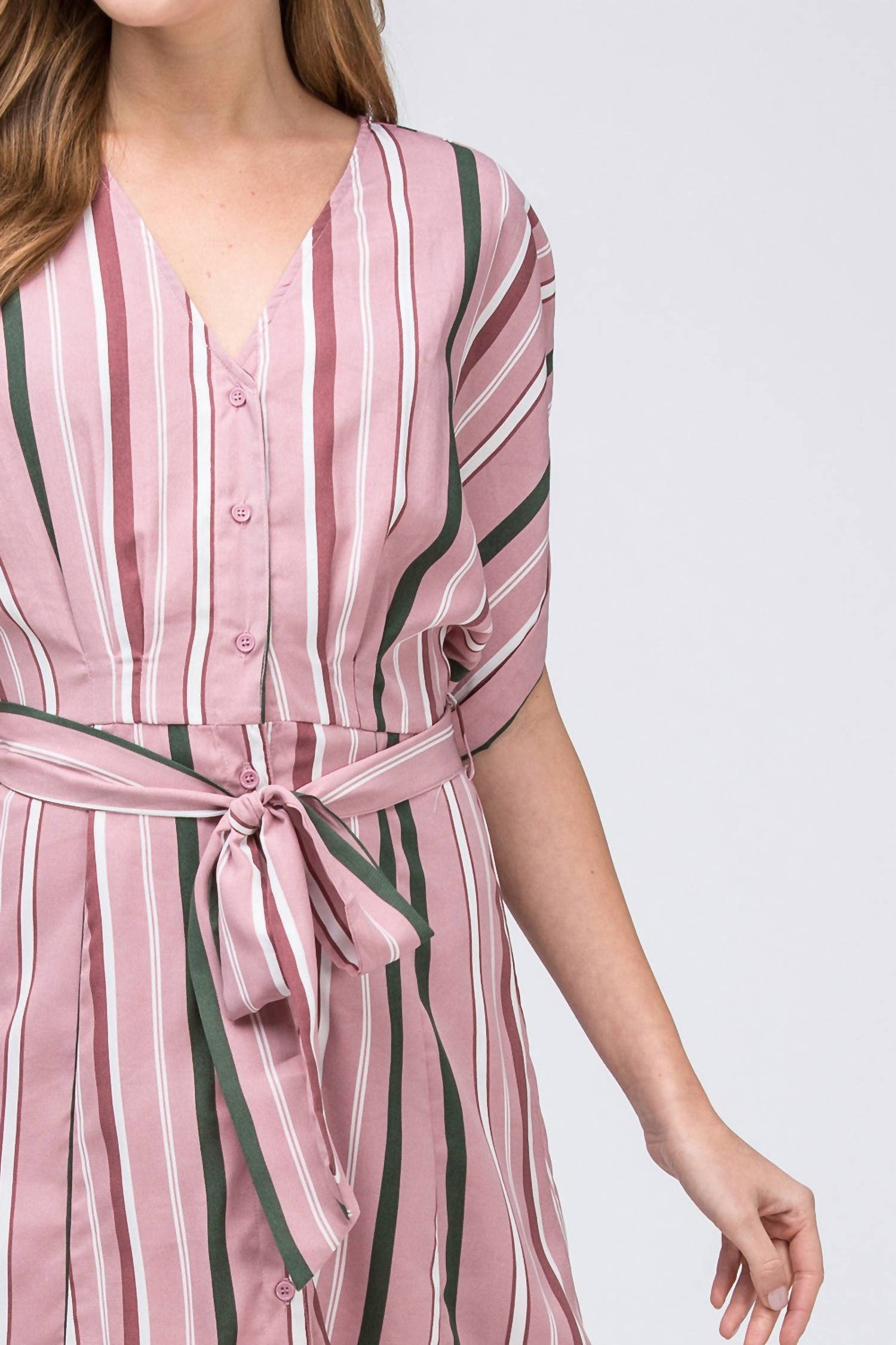 A short and breezy dress for those warmer days. Step into style with the Pink Striped Shirtdress by entro, a perfect transition piece from power hour to happy hour. Featuring elbow sleeves and a V-neck, this mini sheath silhouette is crafted from 100% lightweight polyester, ensuring both comfort and flair. The dress boasts a convenient button down front and a self-tie closure detail at the waist. Care instructions recommend hand washing cold or opting for dry cleaning to maintain its chic appearance.