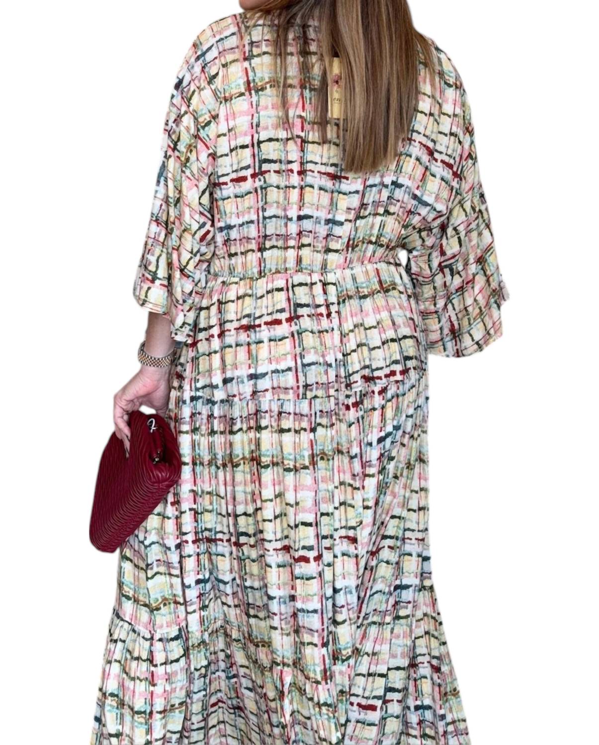Style this maxi with your favorite statement necklace and sandals for the perfect look. Discover the Entro Stripes Pattern Dress, a stunning multi-colored maxi designed for women seeking quiet luxury in their wardrobe. This plus-size dress offers a stylish three-quarter sleeve and flattering V-neck, perfect for a vacation or Mother's Day outing. Crafted from 100% rayon with an inside lining, this pull-on dress features an all-over pattern, ensuring both comfort and chic appeal. Care instructions suggest hand washing to maintain the soft fabric's quality. Available in XL, 1X, and 2X.