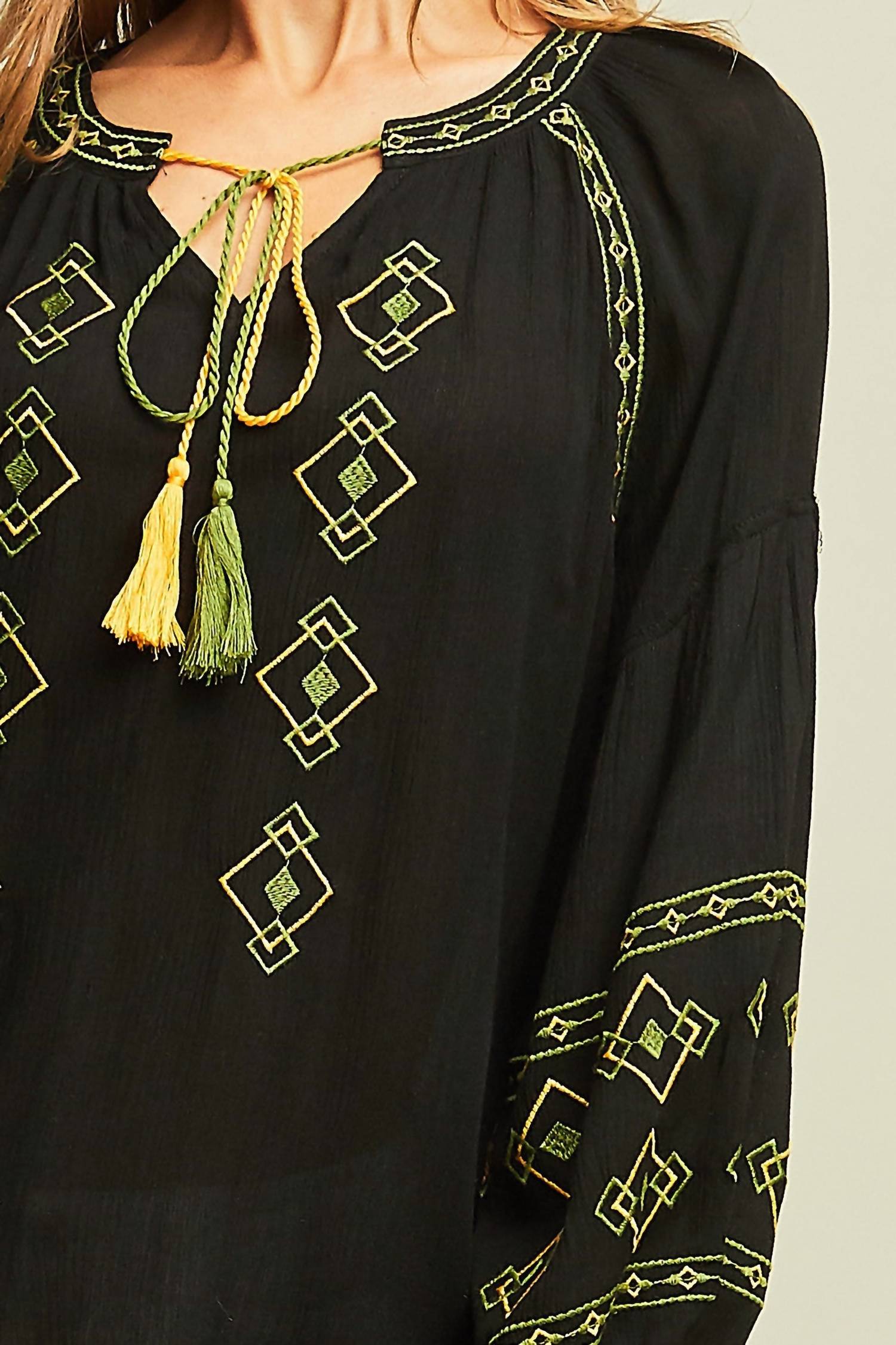 A versatile blouse that works from desk to dinner! Introducing the Tassel Tie Peasant Blouse by Entro, a chic and vibrant addition to your wardrobe. This black blouse showcases long balloon sleeves with elastic at the wrist and colorful embroidery, offering a stylish pop against a crinkled lightweight fabric. Composition: 100% Rayon. Closure: Pull-on style with a split V-neckline and tassel ties. Care: Hand wash or dry clean.