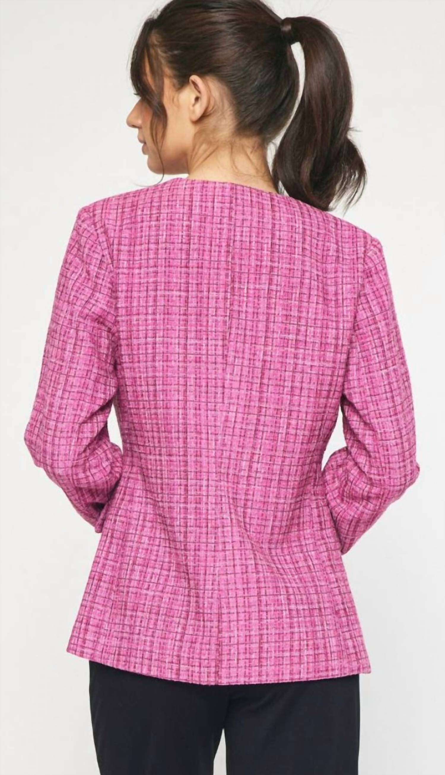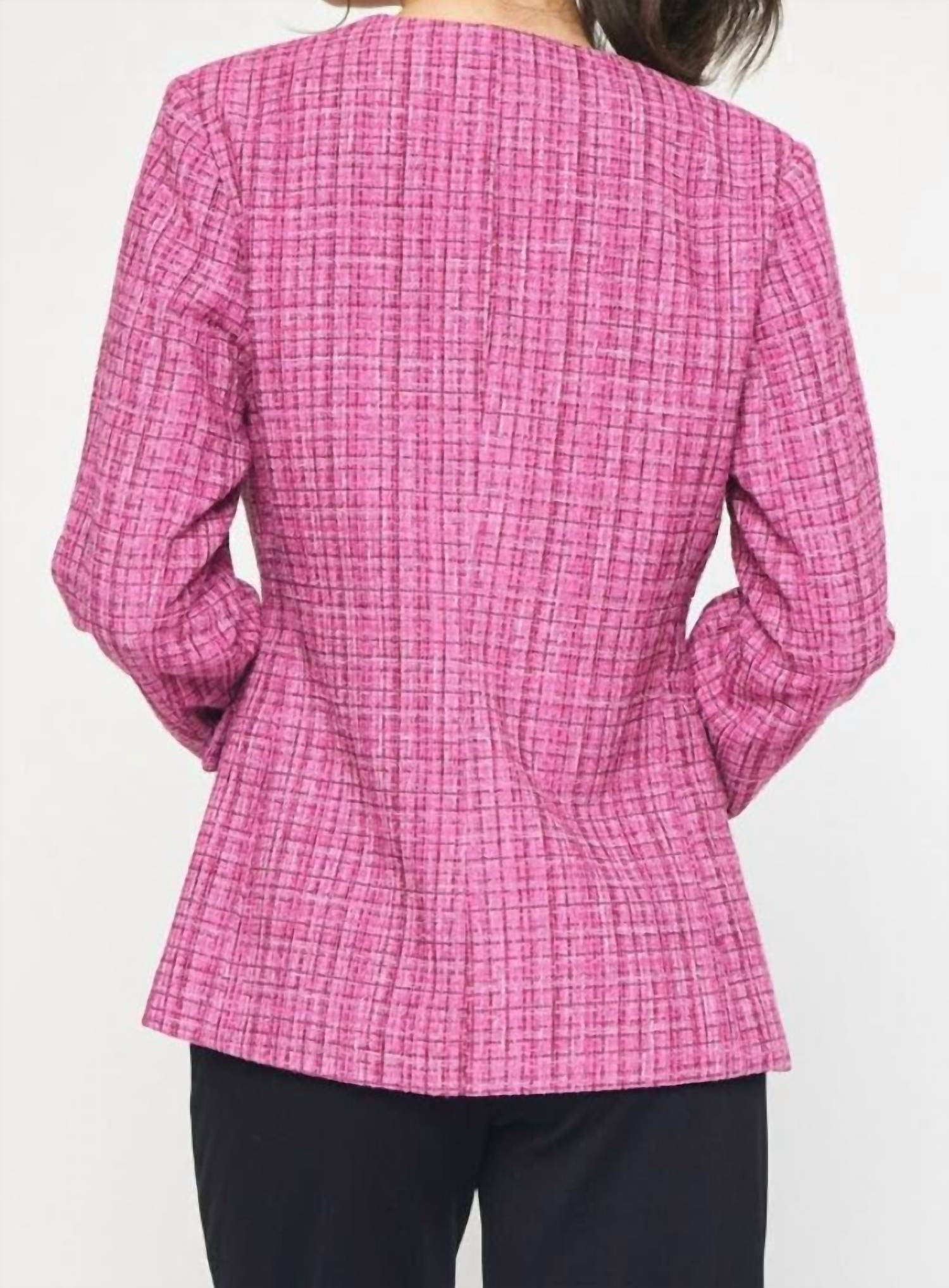A blazer so versatile you can wear it to the office or pair it with jeans for a more casual look. Step into sophistication with the Terrific Tweed Jacket by entro, tailored for modern elegance in vibrant magenta. This long sleeve blazer boasts a practical button front closure and front pockets, with a composition of 80% polyester and 20% rayon for a durable yet stylish finish. Lined for comfort and featuring a classic collar neckline, it's an ideal mediumweight piece for fall. Enjoy the timeless charm and textured weave of this sophisticated jacket, elevating your wardrobe with ease.