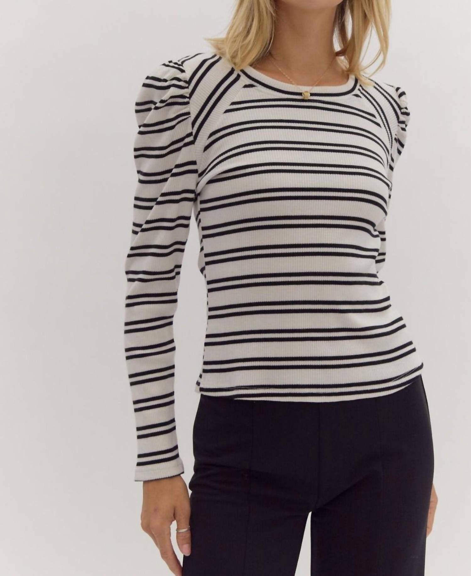 A long sleeve top you can wear with denim, skirts, well... just about anything! Striped Knit Top. Fabric has stretch. Puff Long Sleeve. Unlined. 50% Viscose 40% Nylon 10% Polyester. Hand wash cold, no drum drying.