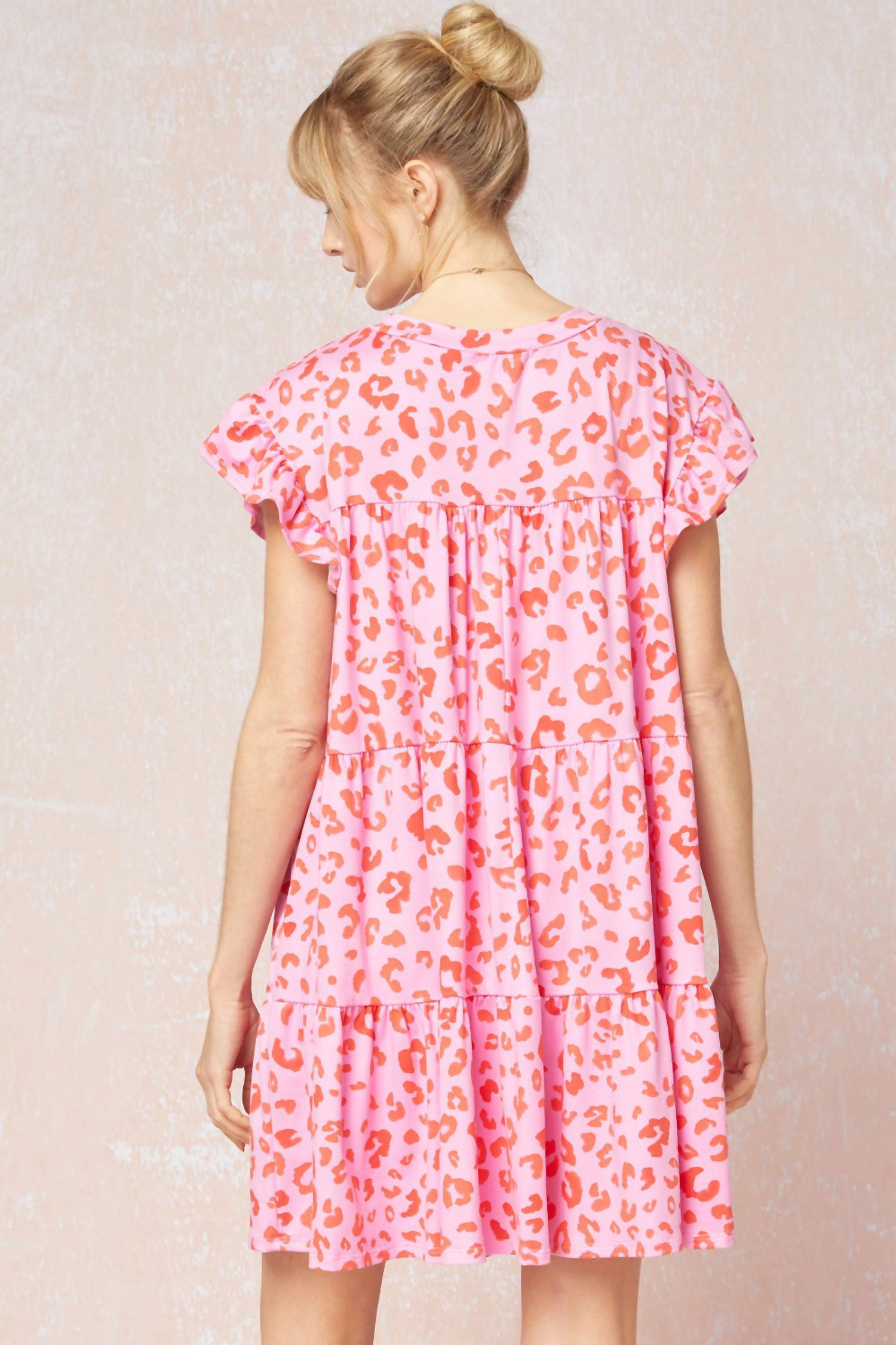 A short and breezy dress for those warmer days. Introducing the Tiered Ruffled Leopard Dress by Entro, a perfect day-to-night piece in a flirty pink hue. This mini dress boasts cap ruffled sleeves, a round neckline, and an oversized A-line silhouette crafted from soft, stretchy polyester fabric. Made in the USA, it features a pull-on closure for easy wear. Care for this kaftan silhouette by hand washing and line drying. Available dimensions include: Small Bust 44", Length 33"; Medium Bust 46", Length 33"; Large Bust 48", Length 33"; XL Bust 50", Length 37"; 1X Bust 52", Length 37"; 2X Bust 54", Length 37".