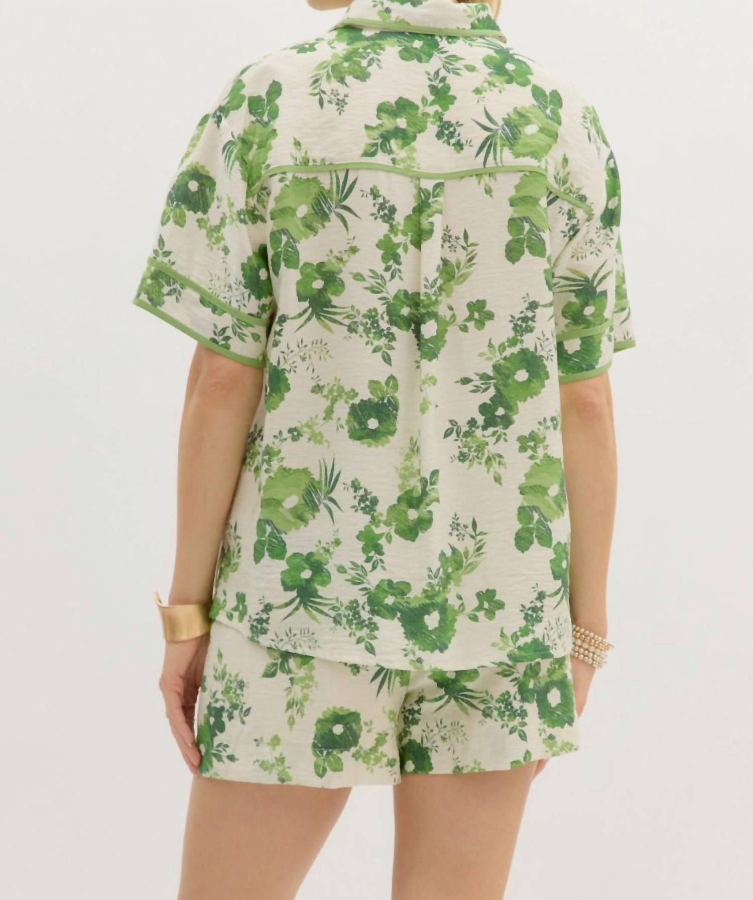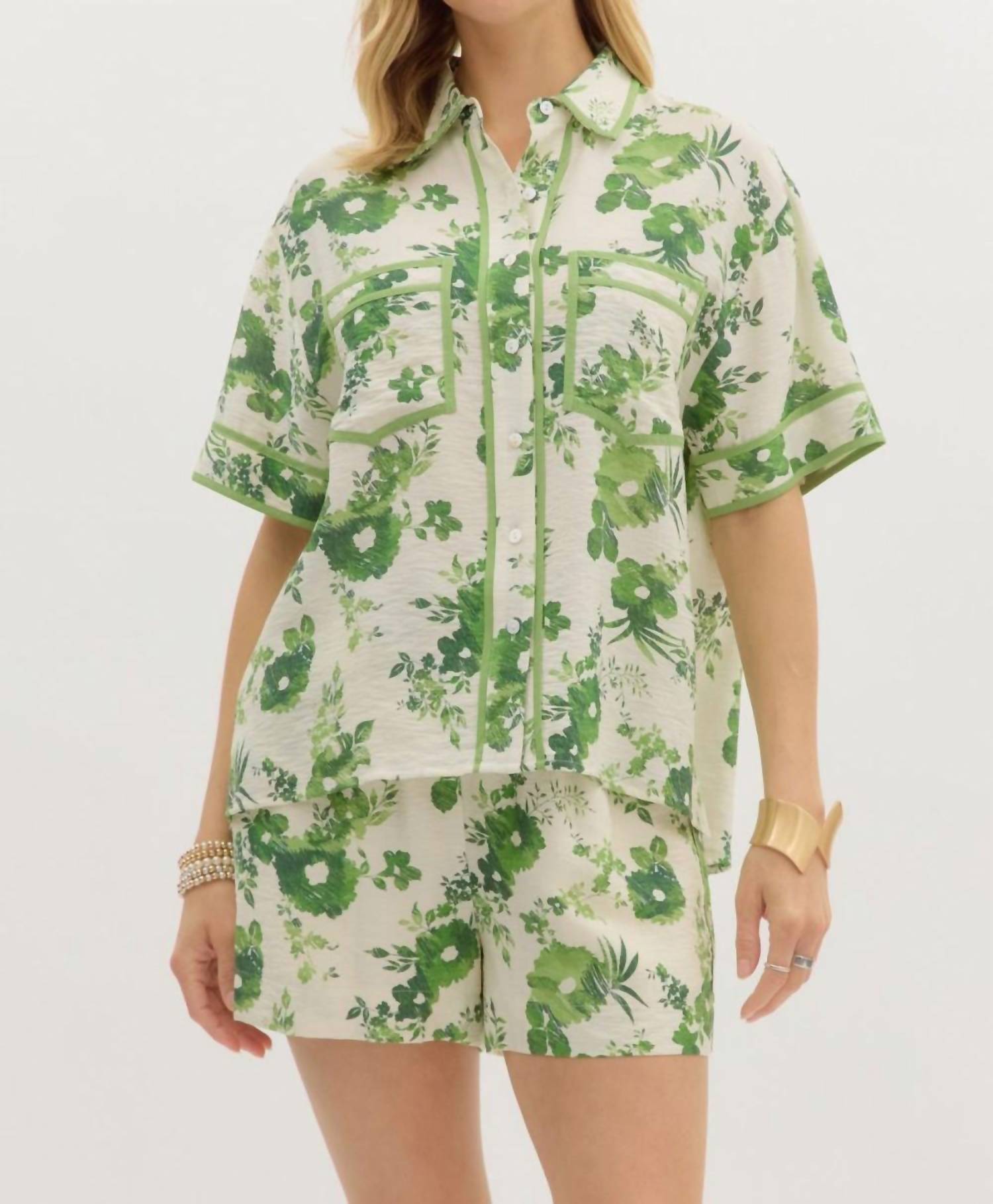 Fit, fabric and functionality. This tank top checks all the boxes. Tropical floral pattern short sleeve top featuring contrast accent binding detail. Collar button front closure. Double shirt pockets. Unlined. Woven. Non-sheer. Lightweight.