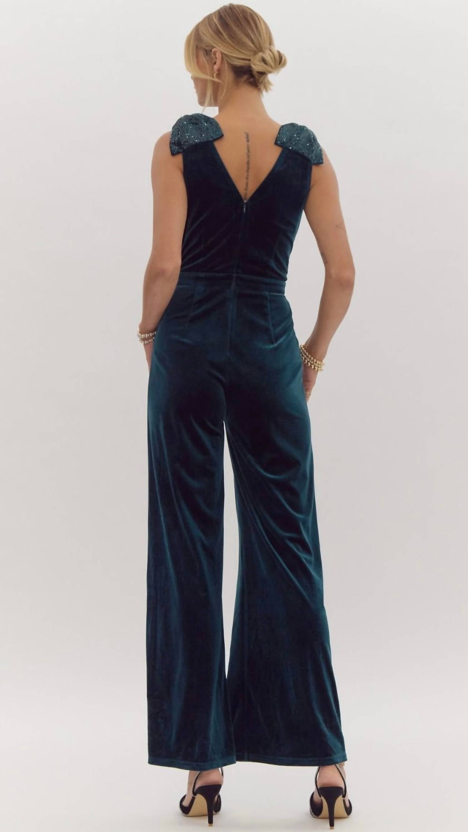 Throw it on and go! Step into elegance with the Velvet Sequin Bow Shoulder Jumpsuit by Entro, a stunning piece in rich emerald designed exclusively for women. Crafted from luxurious polyester, this jumpsuit features a high-waisted, relaxed fit with wide-leg style for effortless sophistication. Intricate sequin bows adorn the shoulders, enhancing the chic, patterned design with a touch of sparkle. Closure: Zip closure. This piece is perfect for special occasions, adding a modern flair to timeless style.