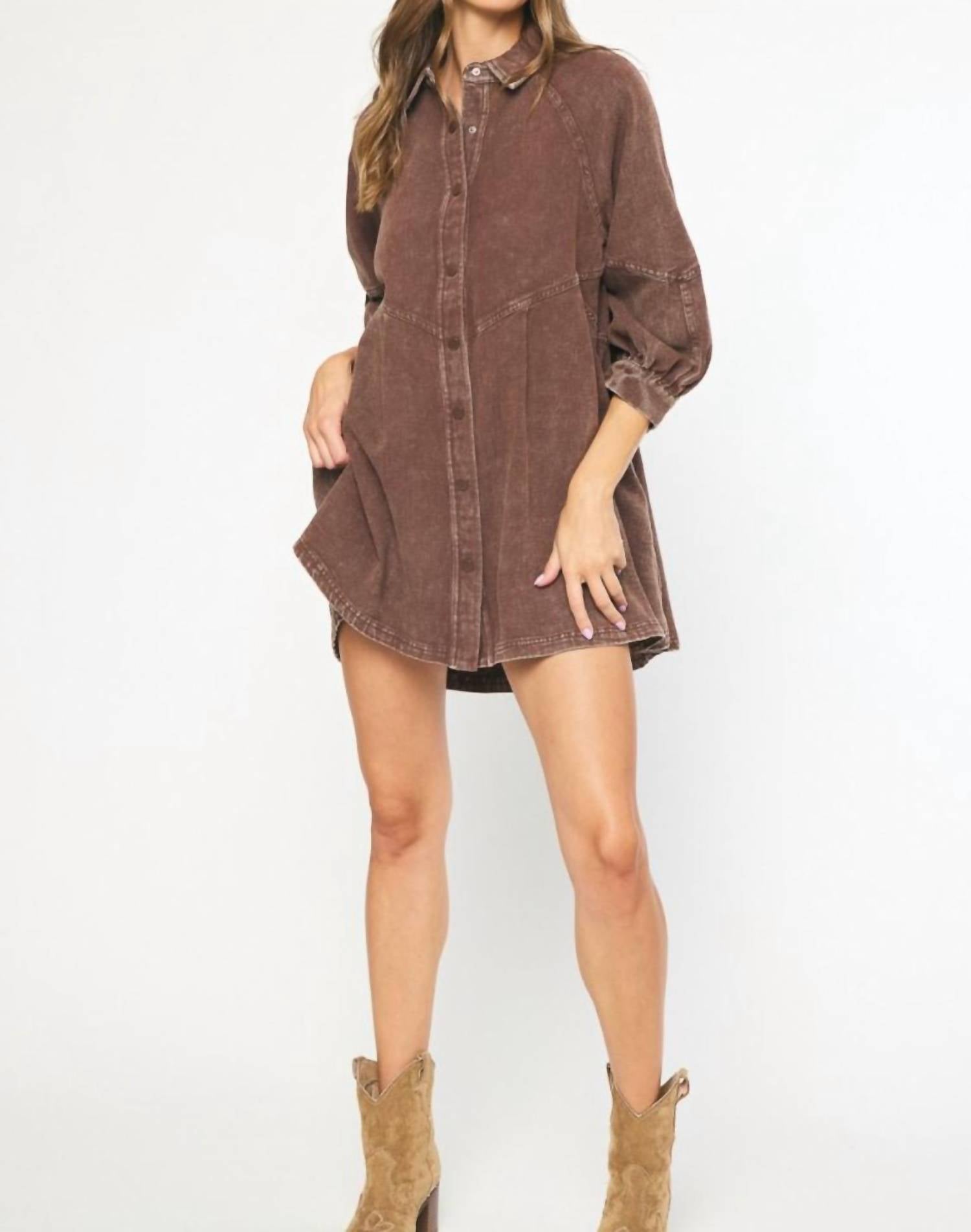 Explore effortless style with the Entro Washed Denim Mini Dress in a rich brown hue, perfect for versatile wear. This lightweight dress features three-quarter sleeves and a classic button down closure with a collared neckline for a touch of sophistication. Made from breathable Cotton, it includes side pockets offering both function and style in a chic A-line silhouette.