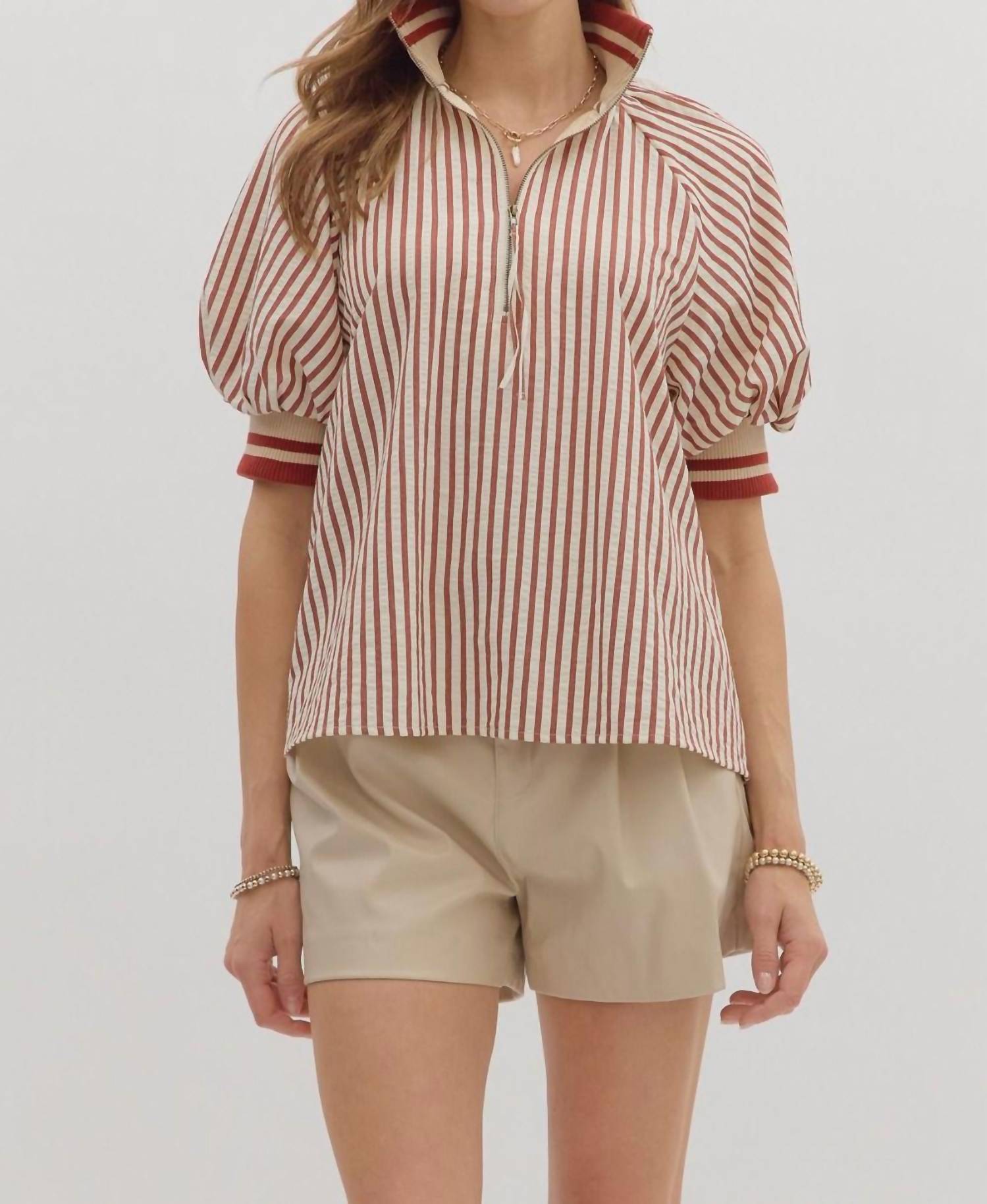 Introducing the Women's Brick Stripe Top by Entro, a vibrant addition to your summer wardrobe. This blouse features short puff sleeves showcasing a stylish stripe pattern, complemented by a multicolor accent band. Closure: Half-zip closure. Perfect for vacation-ready ensembles with a vintage flair.