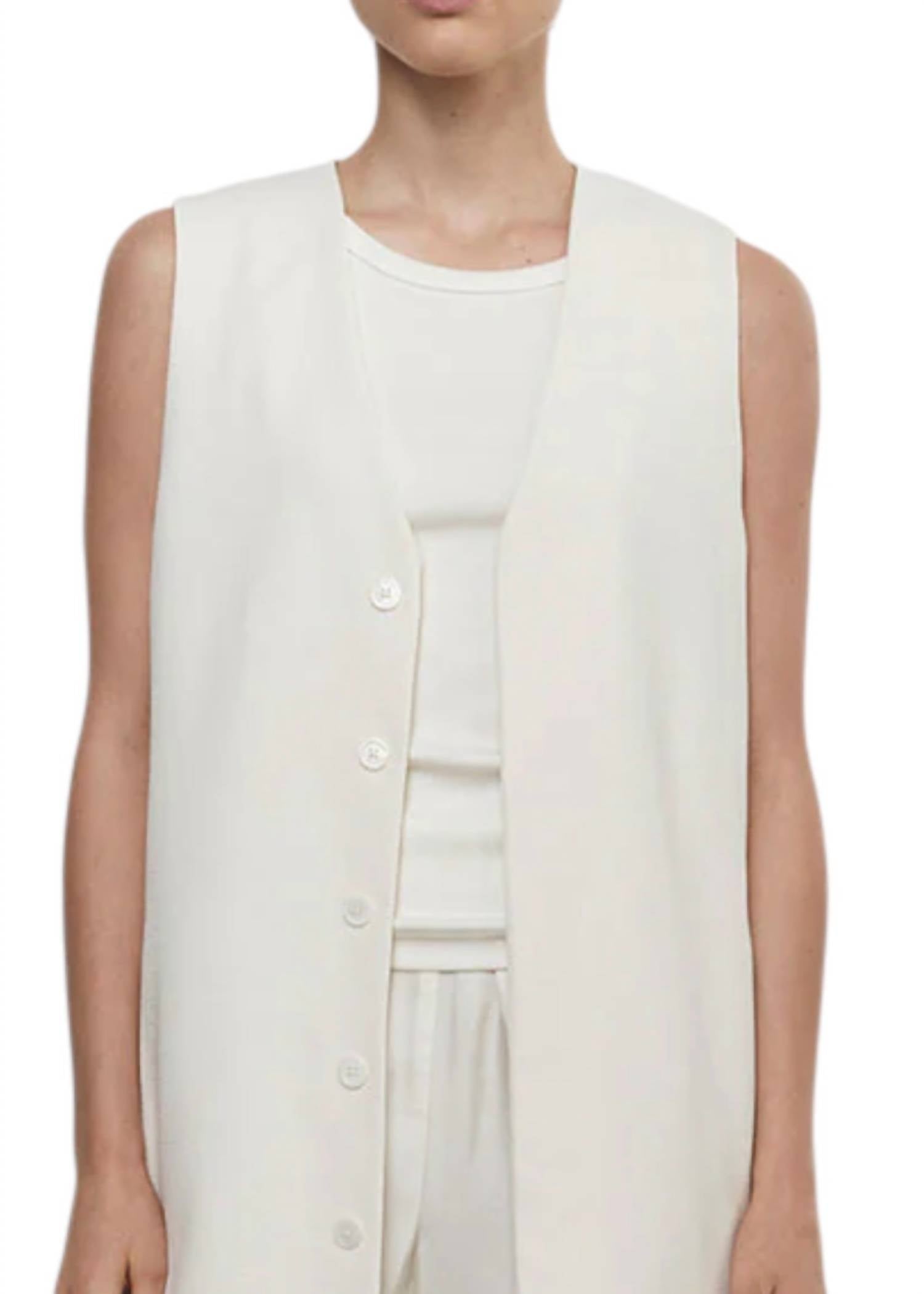 That extra layering piece you didn't know you needed! Introducing the Crepe Tunic Vest by Enza Costa, an elegant addition to your spring wardrobe in a sophisticated cream hue. This vest is sleeveless, crafted from a lightweight, non-stretchy crepe material and designed with a timeless V-neckline. Its relaxed, straight fit is complemented by a concealed front button closure for a polished yet comfortable look. Ideal for vacations or 90s-inspired fashion, it adds a classic touch to any outfit.