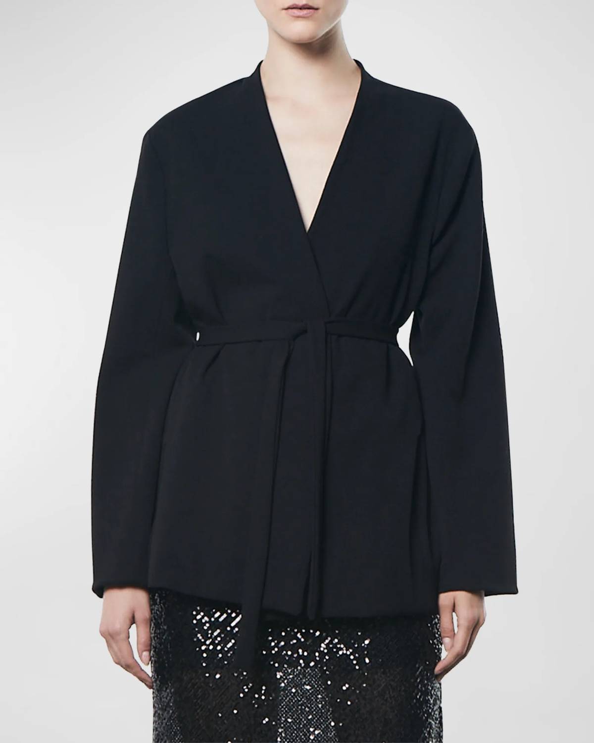 Tailored to perfection, this blazer will be your go-to jacket for years to come. Details Elevate your wardrobe with the Enza Costa Crepe Belted Jacket in Black. This stylish blazer features a flattering open front design with dual side seam zippered pockets for added convenience. Made in the USA, this jacket is crafted from a luxurious blend of 32% Viscose, 64% Polyester, and 4% Lycra. Measuring approximately 30 inches from shoulder to hem, this jacket is perfect for layering over your favorite outfits. Update your look with this versatile and chic Enza Costa jacket.