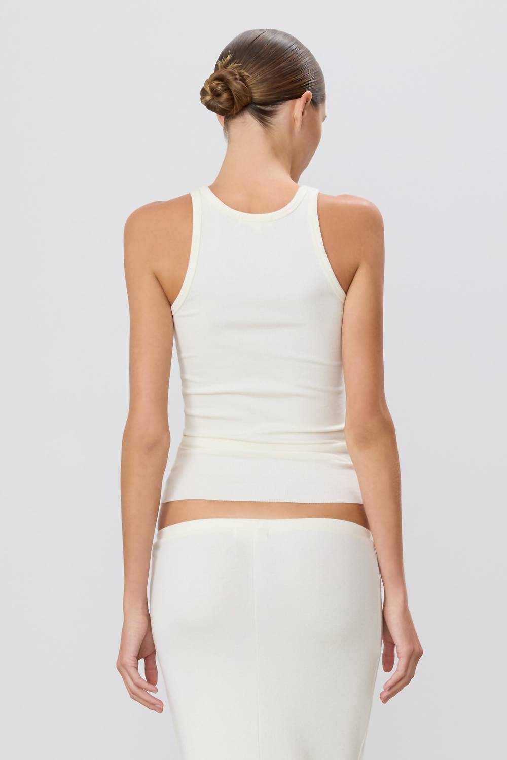 The perfect tank top for those warmer weather seasons. Éterne's high neck fitted tank is crafted from a butter soft ribbed cotton and modal blend. 48% Cotton, 48% Modal, 4% Spandex.  Fits true to size, take your normal size. Designed for a slim fit. Machine wash cold. Non-chlorine bleach. Tumble dry low. Cool iron. Do not dry clean.