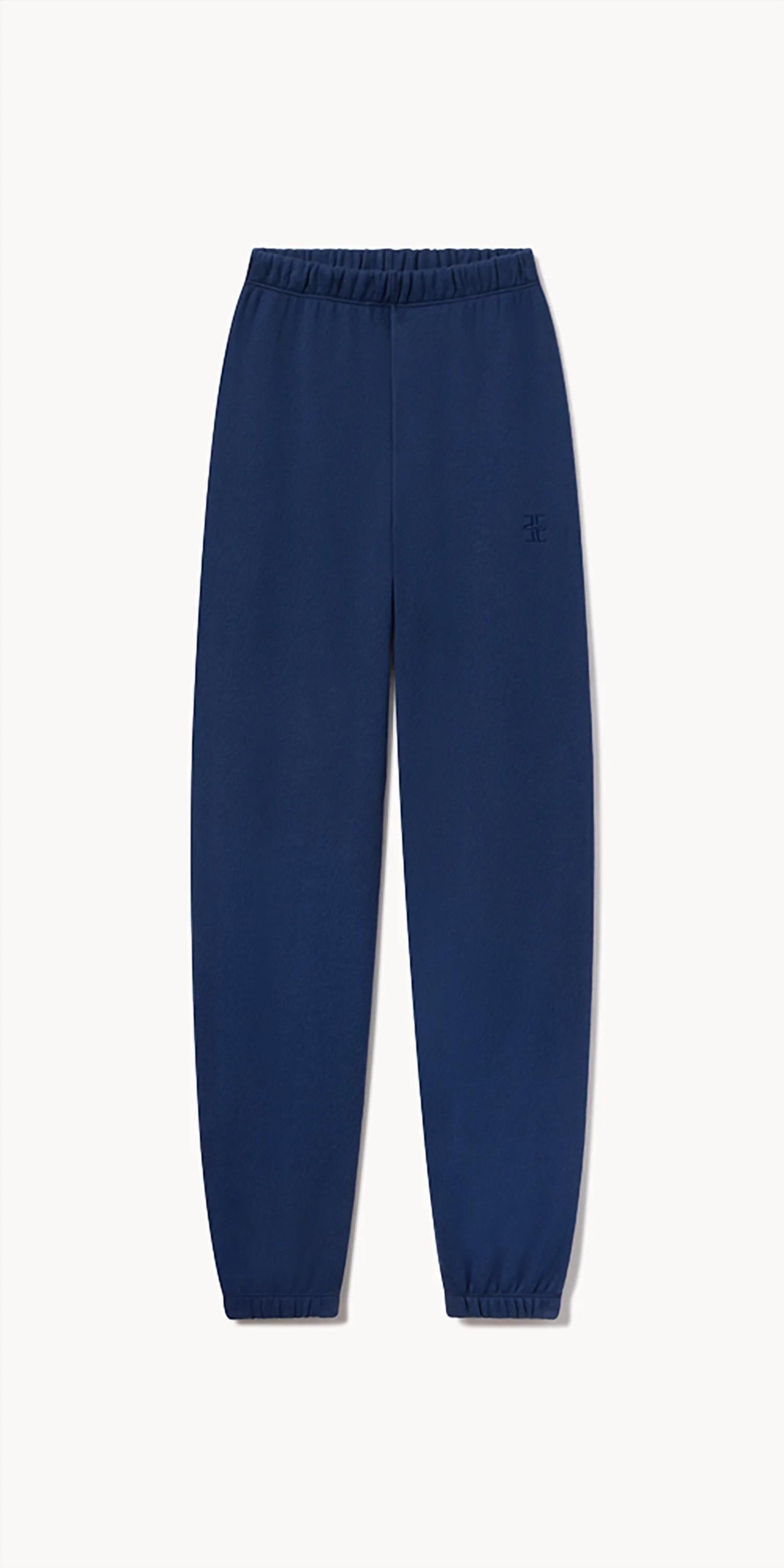 Expertly crafted by ÉTERNE, the Women's Classic Sweatpant in Navy offers relaxed comfort with its ultra-soft French terry material, composed of 77% cotton and 23% modal. Designed with a high-rise fit, these sweatpants feature an elasticated waistband and hem for easy wear. These versatile sweatpants come with a straight-leg style and pull-on closure, perfect for both spring outings and casual holiday gatherings. The model, at 5ft 5in, wears a size S for a true-to-size relaxed fit.