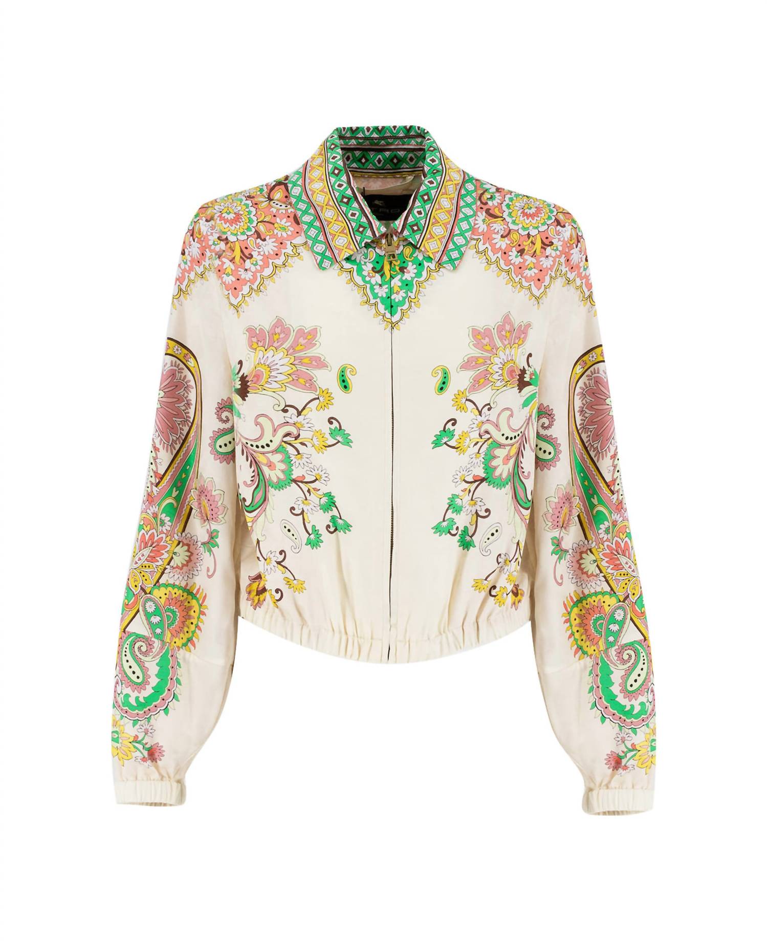 Make any outfit instantly cool by pairing it with this bomber jacket. Discover the Women's Print Cropped Bomber Jacket by ETRO, an embodiment of sophisticated maximalism ideal for spring. This long sleeve jacket features a striking jacquard print on a white base, ensuring you make a stylish statement. Made in Italy, it comes with a secure zip fastening and an elasticated hem for a comfortable fit. Ideal for enriching your wardrobe, this piece combines classic elegance with modern flair effortlessly. 65% Polyester, 35% Viscose.