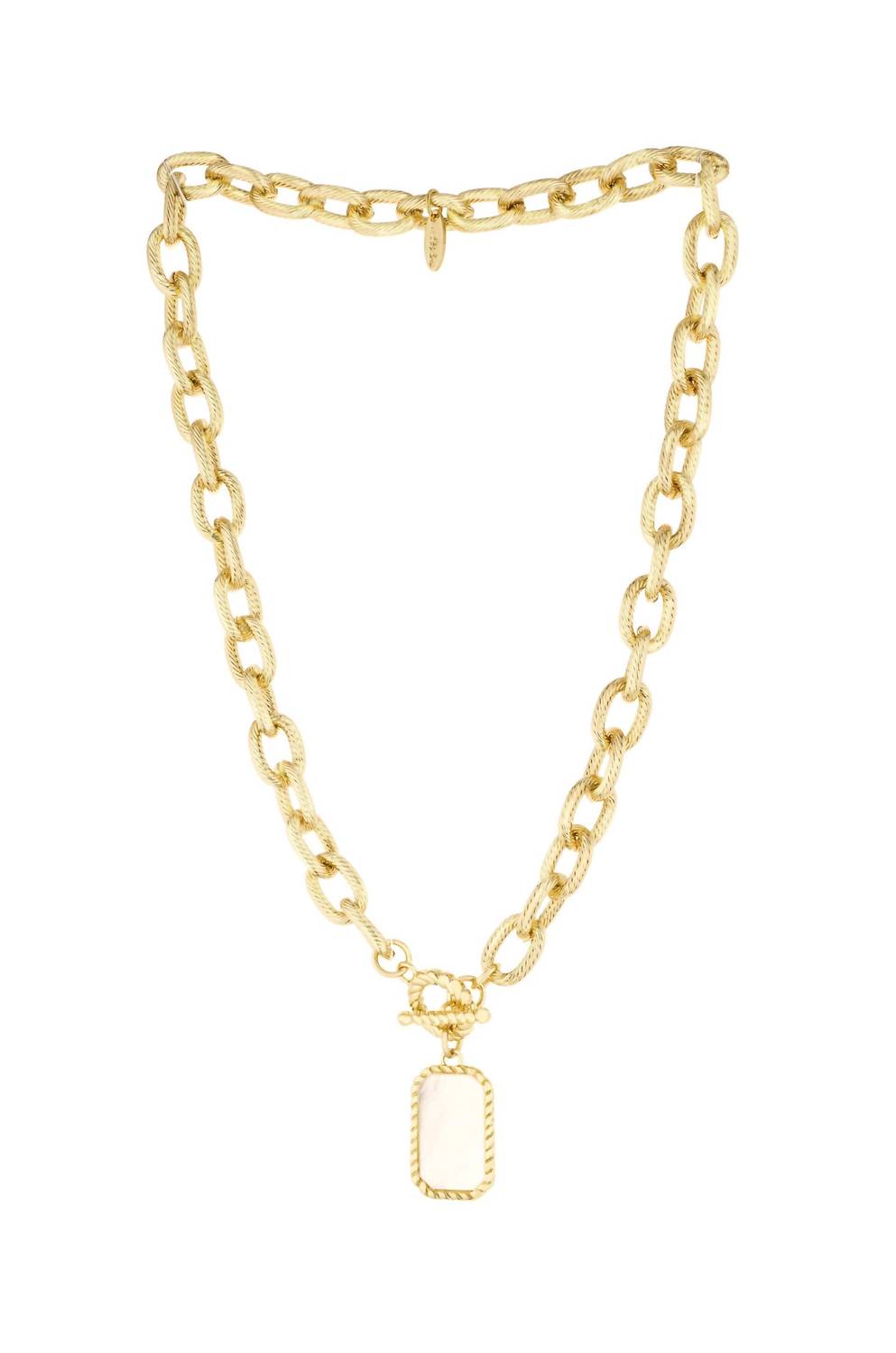 The perfect stand-out necklace that complements even the most basic t-shirt. Elevate your accessory game with the Women's Chain Link and Mother of Pearl Necklace by Ettika, a stunning piece in luxurious gold. This fashion necklace features a captivating Mother of Pearl gemstone set in a bezel setting, offering a classic yet contemporary look. The jewelry boasts an impressive 17-inch drop, all plated in 18k yellow gold for a timeless finish. Originating from Ettika, this necklace embodies elegance and style for any occasion.