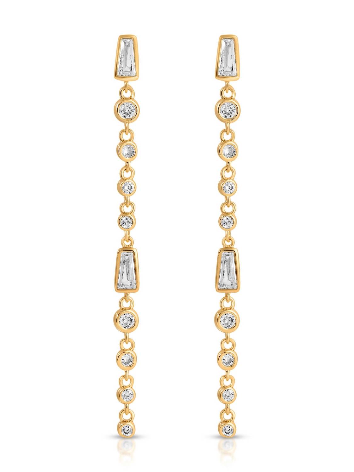 Enhance your style with the Women's Crystal Linear Earrings by Ettika, crafted in elegant gold. Featuring an 18k gold plating and adorned with cubic zirconia, these earrings are designed in a sleek shield stone shape with a bezel setting. The post closure ensures a secure fit while the 2.36" length adds a touch of sophistication to your look. Radiate with the charming appeal of these fashion earrings, perfect for any occasion.