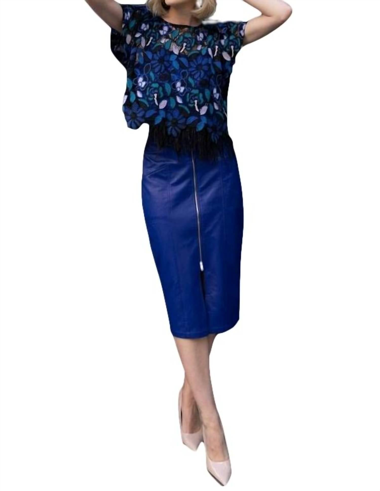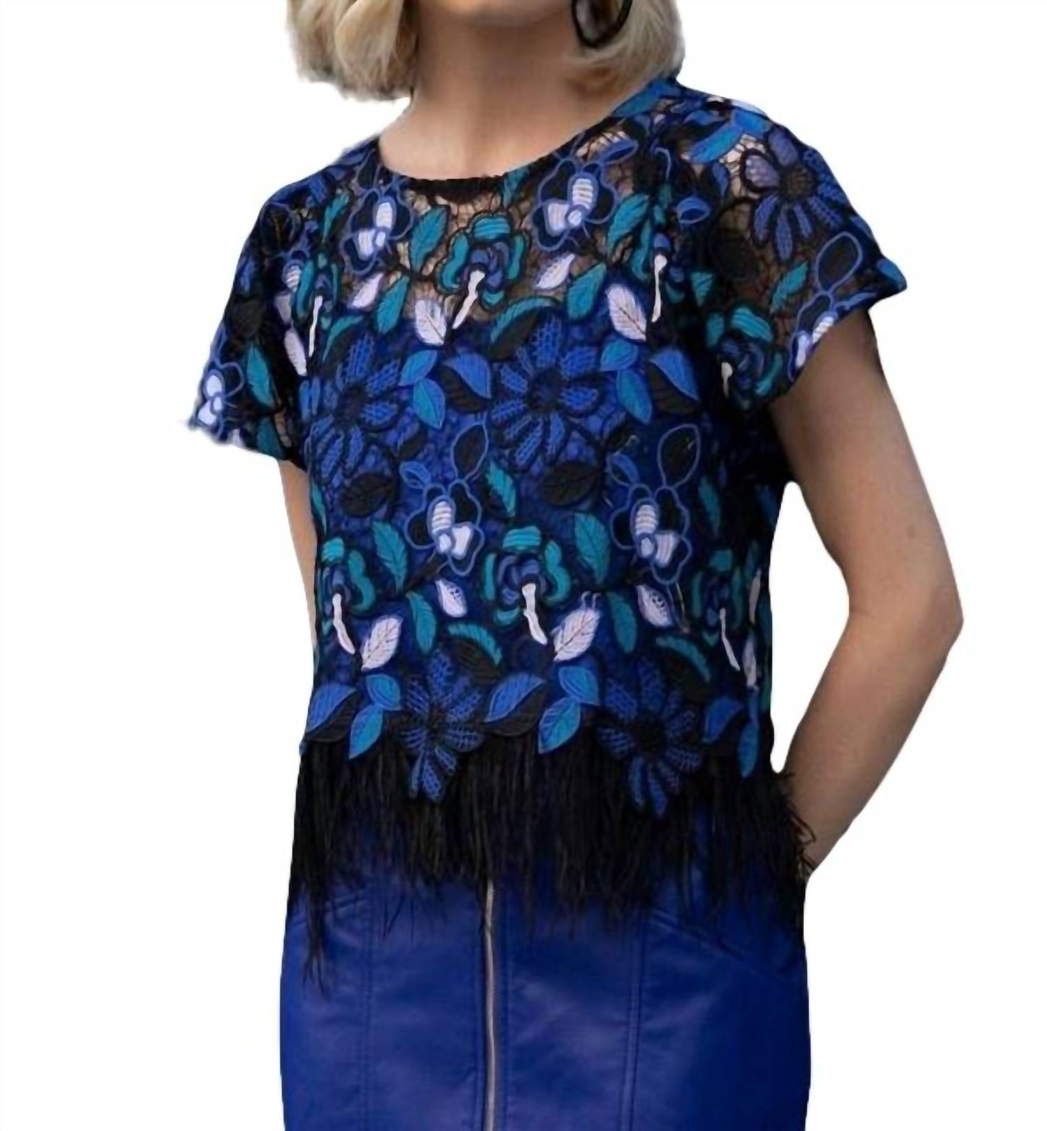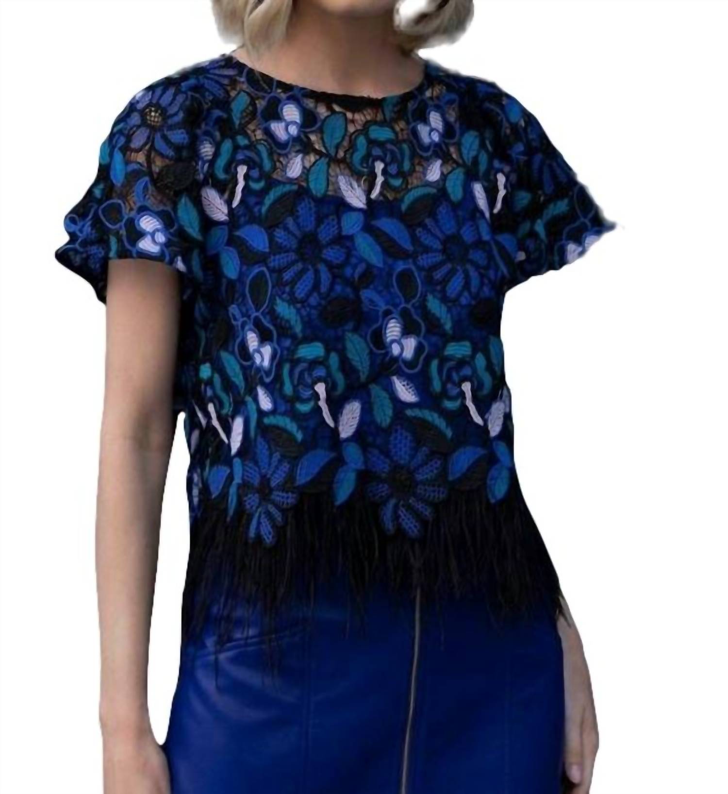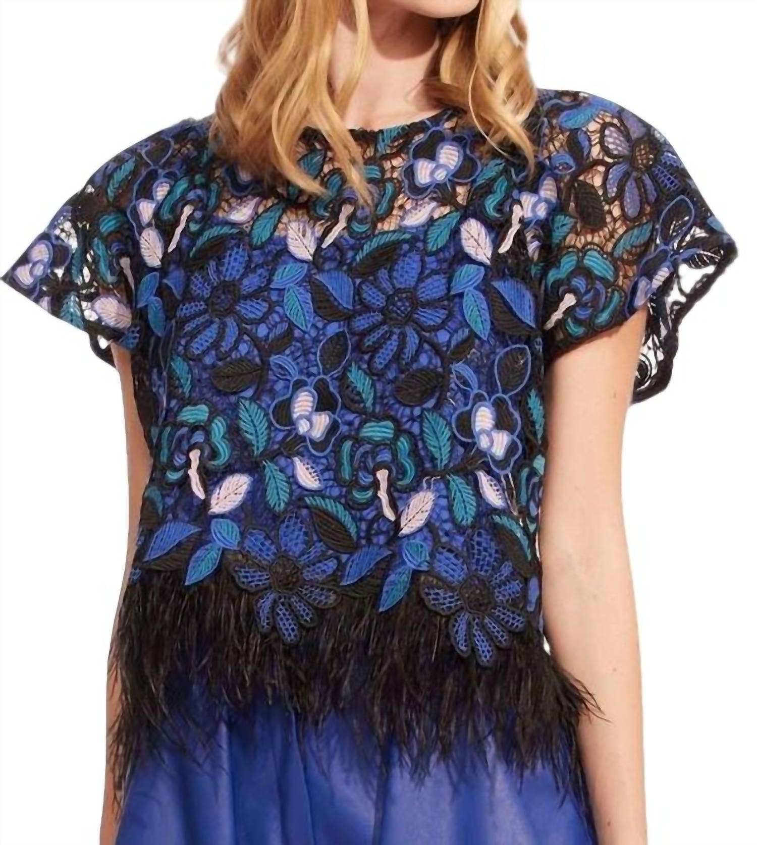 This gorgeous lace short sleeve top with black feather trim makes comfortable-yet-chic style truly effortless. Feather trim. Short sleeve. Round neck. Pullover style